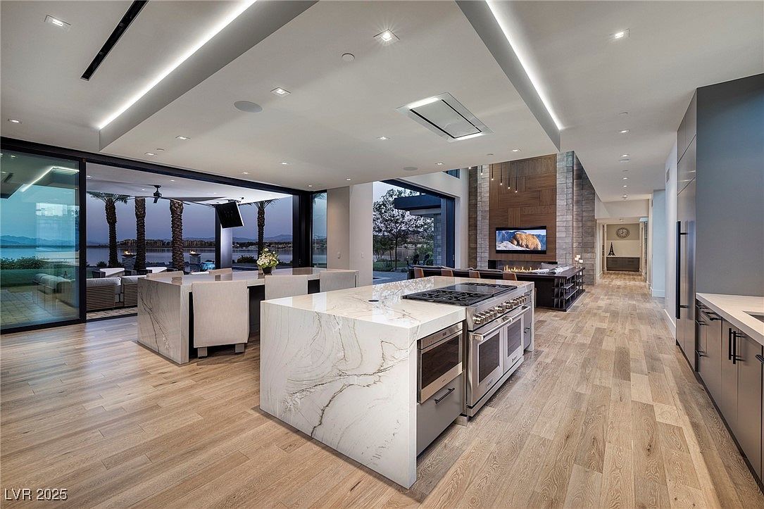 A spacious modern kitchen seamlessly merges with the living and dining areas, creating a bright and welcoming hub for family gatherings. Sleek marble countertops and a central island with a premium gas range anchor the space, while light-toned hardwood flooring adds warmth. Floor-to-ceiling windows slide open to a large patio, blending indoor comfort with outdoor living and letting in abundant natural light. Soft, neutral tones dominate the palette, accented by contemporary furnishings and built-in cabinetry, making the area both elegant and practical. Ideal for lively entertaining or relaxed family evenings, the open layout promotes effortless togetherness.