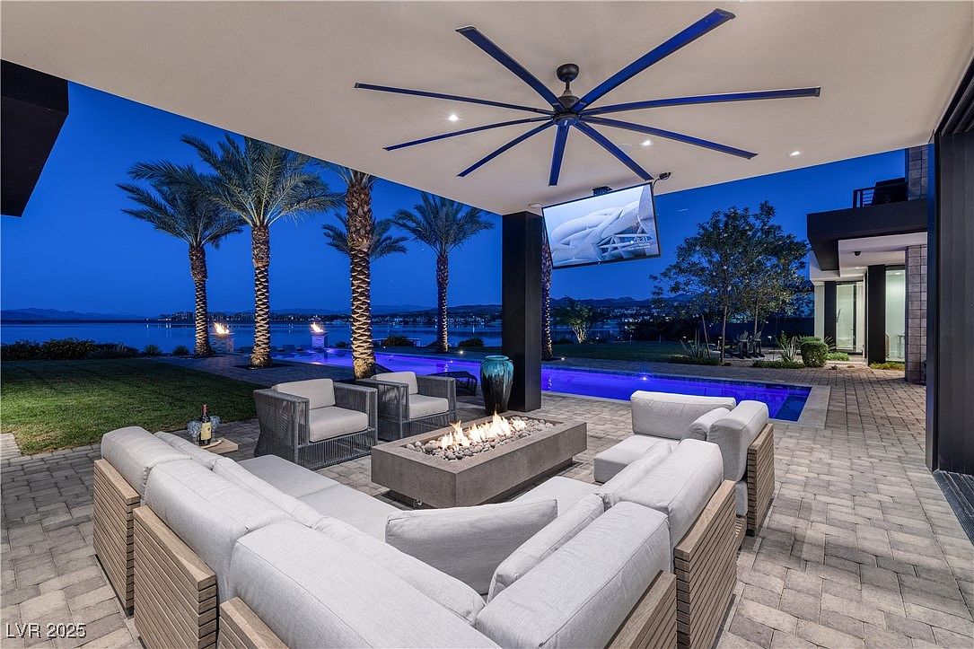 A spacious covered patio creates an inviting outdoor lounge, centered around a modern rectangular fire pit with plush, neutral-toned sectional sofas and armchairs arranged for conversation and relaxation. Overhead, a dramatic ceiling fan and recessed lighting add comfort and ambiance, while a mounted television offers entertainment for family gatherings. The open layout blends seamlessly with the backyard, featuring a sparkling pool, palm trees, and a scenic waterfront view beyond. Durable pavers, contemporary outdoor furniture, and thoughtful lighting make this a perfect family-friendly space for entertaining, with plenty of room for kids to play safely while adults unwind in style.