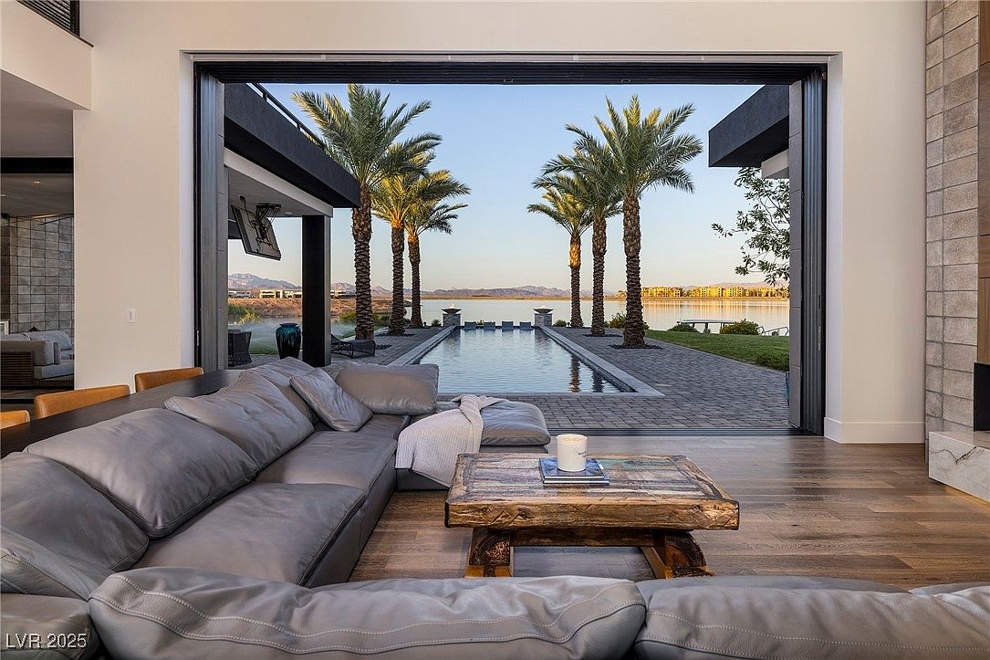 Expansive sliding glass doors seamlessly merge the living room with the backyard, creating an inviting indoor-outdoor flow perfect for family gatherings and entertaining. A plush, oversized sectional in soft gray provides ample seating for all ages, centered around a rustic wooden coffee table. Pale hardwood flooring warms the space, complemented by neutral walls and a modern fireplace. The backyard features a tranquil rectangular pool framed by palm trees, offering breathtaking views of the water and distant mountains. The open-concept design maximizes natural light and encourages a relaxed, family-friendly atmosphere with unobstructed sightlines for both supervision and conversation.