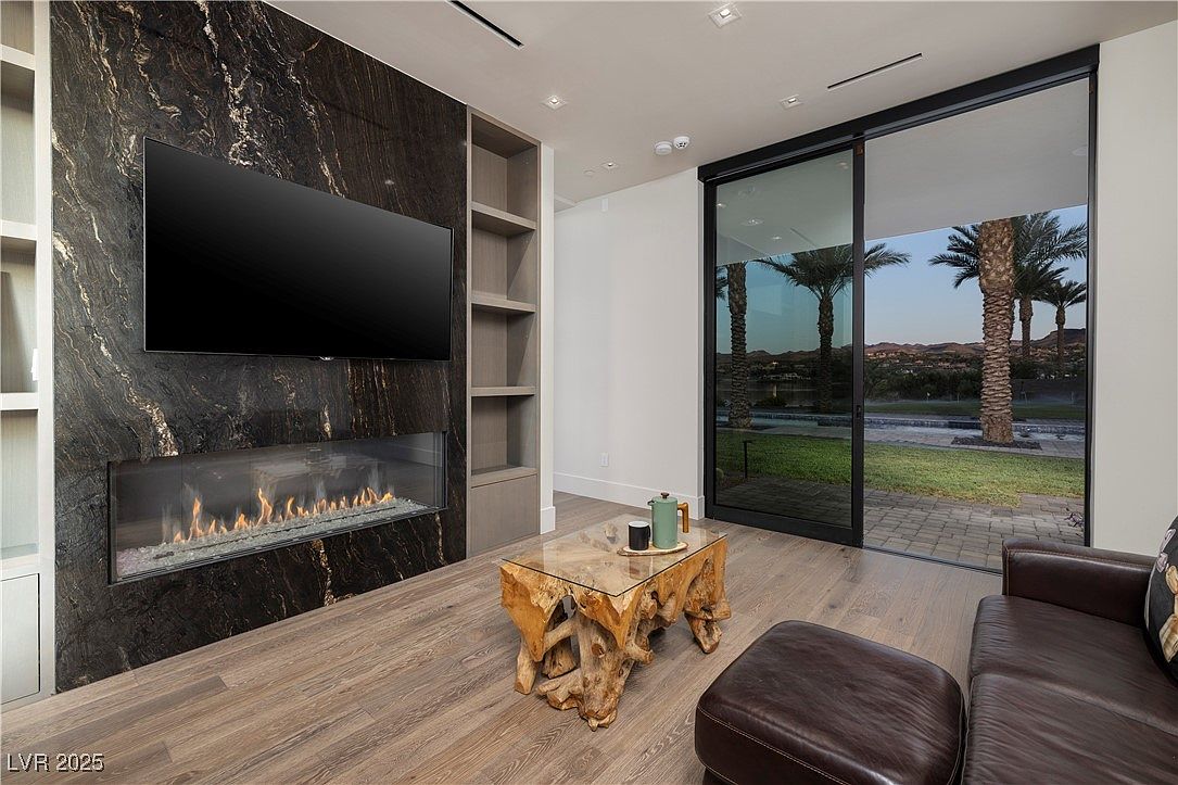 A stylish living area featuring sleek contemporary design elements, anchored by a striking marble fireplace wall topped with a mounted flat-screen TV. Smooth wood floors add warmth and comfort, while the unique coffee table with a sculptural wooden base brings in natural texture. Ample built-in shelving provides organizational space, ideal for families. Large sliding glass doors flood the room with natural light and offer picturesque views of the palm-lined backyard, seamlessly blending the indoors with the outdoors. The neutral color palette, clean architectural lines, and cozy seating make this space both elegant and welcoming for everyday family life.