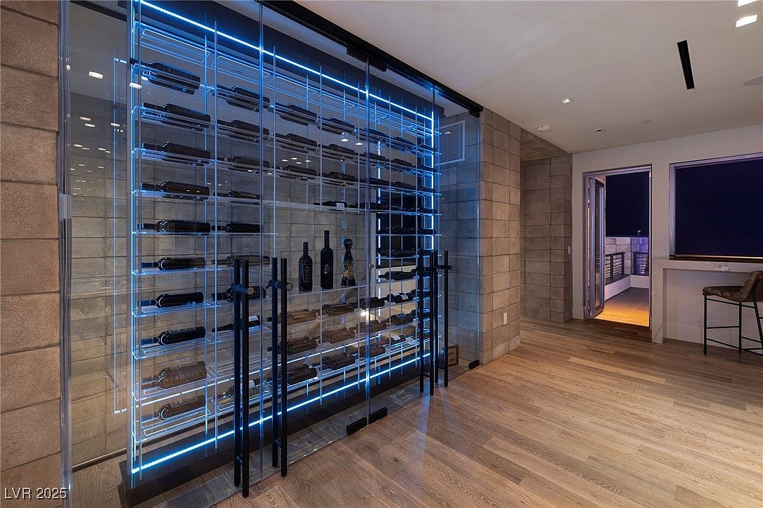 A striking wall-mounted wine display is the focal point, encased in sleek glass panels with blue LED lighting that adds a sophisticated, contemporary touch. The surrounding space features warm wood flooring and neutral-toned tile walls, blending modern industrial elements with inviting comfort. Nearby, a bar-height counter and leather stool create a cozy spot for casual gatherings or wine tastings. Large windows and a doorway to the balcony invite natural light while offering an elegant indoor-outdoor transition, making this a family-friendly yet adult-oriented space perfect for entertaining in style.