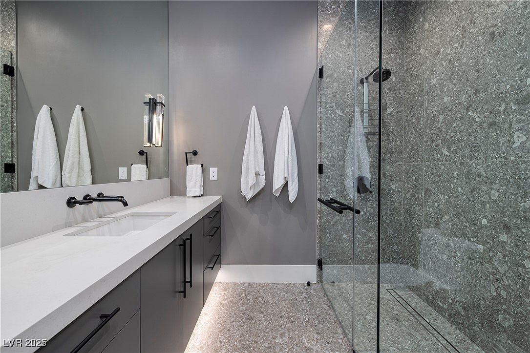 This sleek bathroom features a spacious double-sink vanity topped with a pristine, white quartz countertop that offers ample room for morning routines. Matte black fixtures and handles provide a striking contrast against the soft gray cabinetry and walls. A large frameless mirror enhances light and depth, complemented by contemporary sconce lighting. The walk-in shower boasts full-height stone tile, a glass enclosure, and built-in shelving, blending elegance and practicality. White towels and under-cabinet lighting add comfort and accessibility, making the space both family-friendly and inviting for all ages. The sophisticated color palette and minimalist design create a refreshing, spa-like atmosphere.