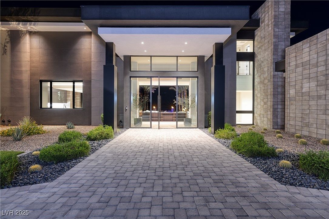 A striking modern entryway welcomes visitors with clean lines, expansive glass doors, and a wide paved walkway flanked by drought-tolerant landscaping—perfect for families seeking low-maintenance, eco-friendly beauty. Architectural pillars frame the entrance, creating a sense of grandeur and symmetry. Warm exterior lighting highlights the neutral stone and concrete façade, setting a serene tone. The front garden features manicured bushes, succulents, and desert plants, ensuring child-safe, non-toxic greenery and easy upkeep. Large windows invite natural light inside, enhancing the home’s inviting ambiance and open-plan appeal while also offering views of interior gathering spaces designed for family togetherness.