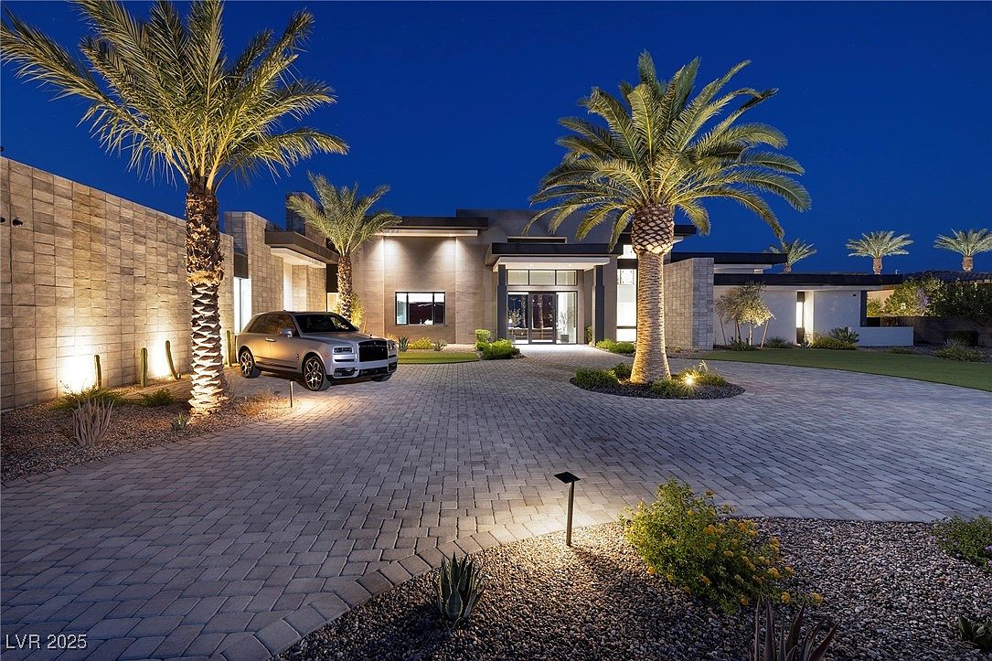 A stunning modern driveway welcomes guests with symmetrical palm trees and soft up-lighting, creating a grand first impression. The paved driveway leads directly to the home’s contemporary facade, which exudes sophistication with its clean lines and earth-toned stonework. Family-friendly landscaping features drought-tolerant plants and ample green lawn space, perfect for children to play safely. Architectural details such as the large windows and covered entryway provide both style and functional shelter. The layout allows for convenient parking and easy access to the entrance, combining curb appeal with practical suburban living for the modern family.