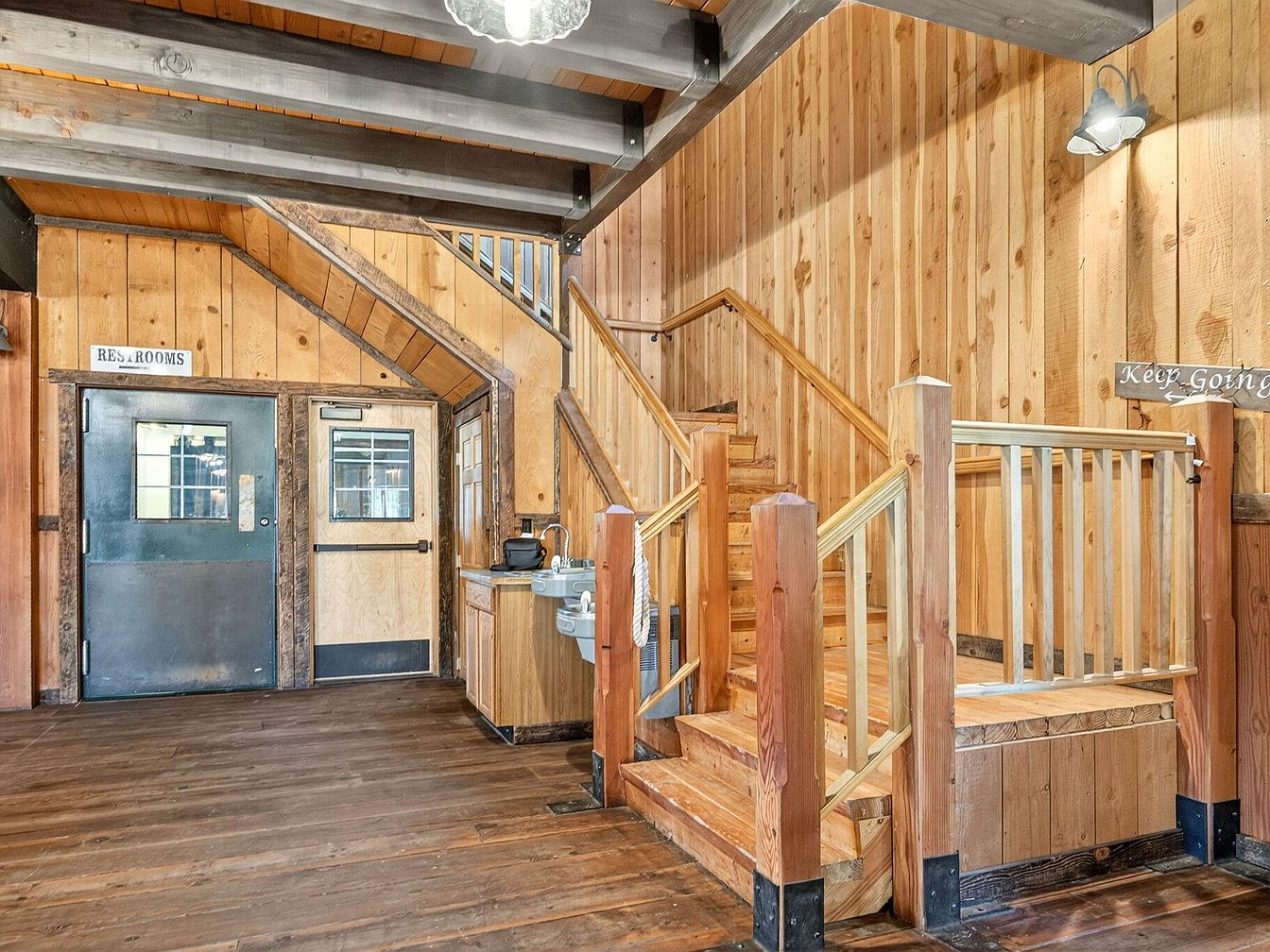 Warm, natural wood paneling creates a cozy and inviting atmosphere in this main stairway area. Wood floors, matching railings, and exposed beams enhance the rustic charm, while high ceilings open the space and add architectural interest. The stairway is thoughtfully designed with wide, sturdy steps and a child-friendly handrail, making it accessible for families. The built-in water fountain and nearby restrooms add functionality for all ages. Soft, neutral tones dominate the palette, complemented by subtle black trim on doors and light fixtures, giving the space a balanced, welcoming feel ideal for busy family life.