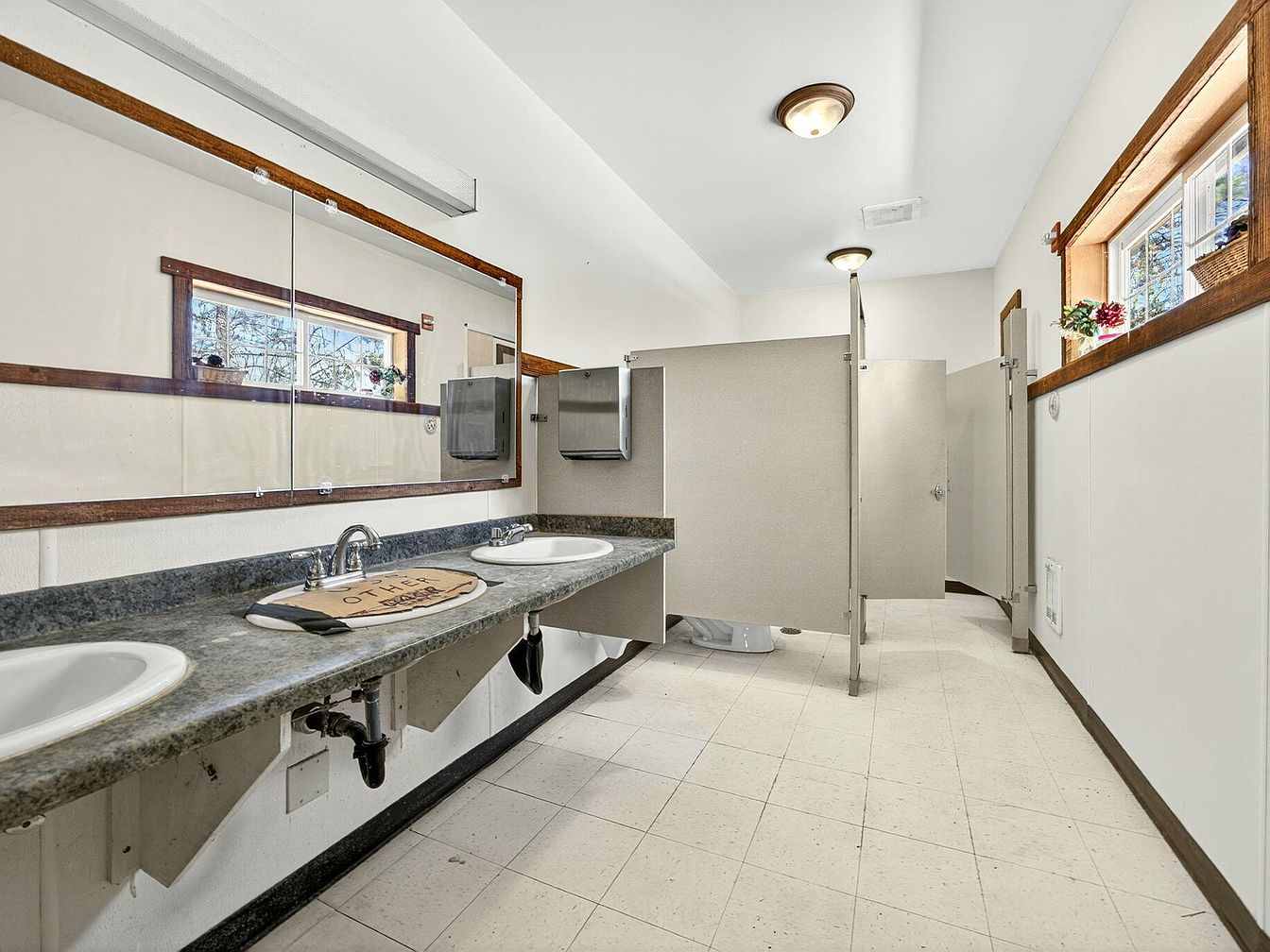 A spacious and practical bathroom features dual sinks set in a durable speckled countertop, ideal for busy family life and morning routines. The large wall mirror with a wooden frame provides ample reflection for multiple users at once, enhancing the sense of openness. The neutral color palette of off-white walls and stone-grey accents creates a clean, welcoming feel. Sturdy stainless steel fixtures and dispensers add to its functionality. Multiple private stalls offer privacy, making the space suitable for both guests and family. Natural light streams in through two wide windows, each decorated with small potted plants for a touch of warmth.