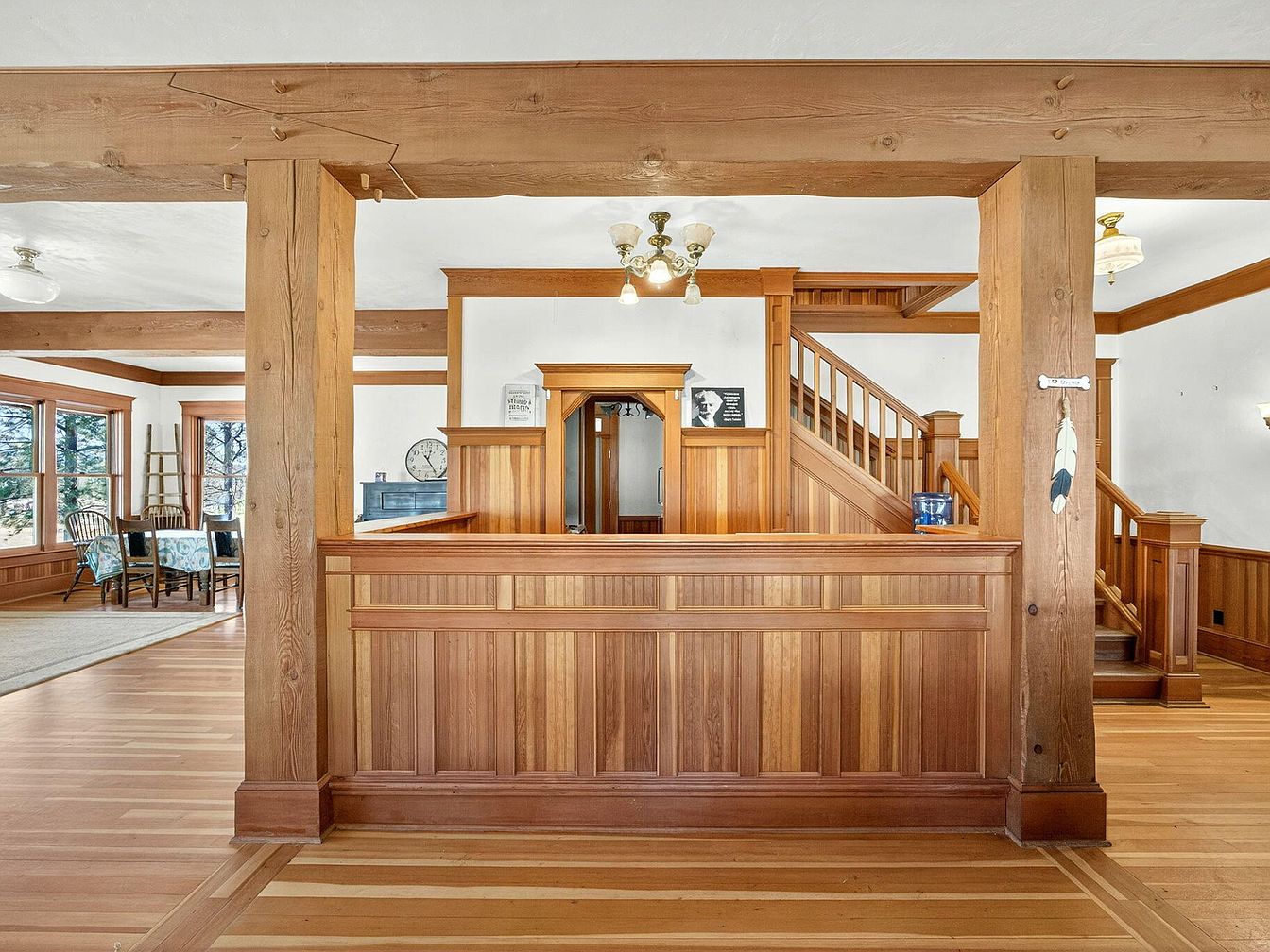 Warm, natural wood tones dominate the staircase and hallway, creating a cozy and welcoming entry point. Pillars and paneling showcase fine craftsmanship with classic vertical and horizontal lines, reflecting traditional American architecture. The open layout connects the hallway to a bright dining space with multiple large windows that fill the area with natural light, perfect for family gatherings. Neutral paint on the walls provides a subtle contrast to the rich wood, while simple, vintage chandeliers add nostalgic charm. The sturdy banister and easy-to-navigate stairs make the space both beautiful and family-friendly, inviting relaxation and togetherness.