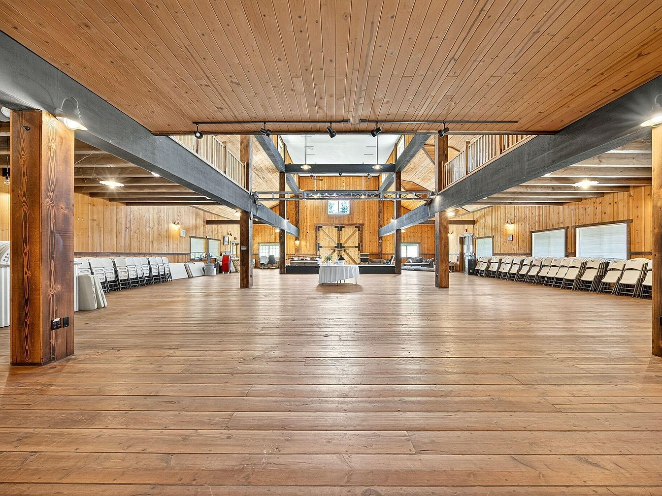 A spacious great room with warm wood paneling and exposed beams offers a stunning first impression. The open layout features a high, vaulted ceiling and wide-plank hardwood floors, creating an inviting and versatile environment perfect for large gatherings or family events. Rows of folding chairs along the walls provide flexible seating, making it ideal for celebrations or casual get-togethers. Large windows allow natural light to fill the space, while wrought iron railings above add a touch of industrial flair. The natural wood color palette enhances the cozy, rustic atmosphere and emphasizes family-friendly, durable features throughout.