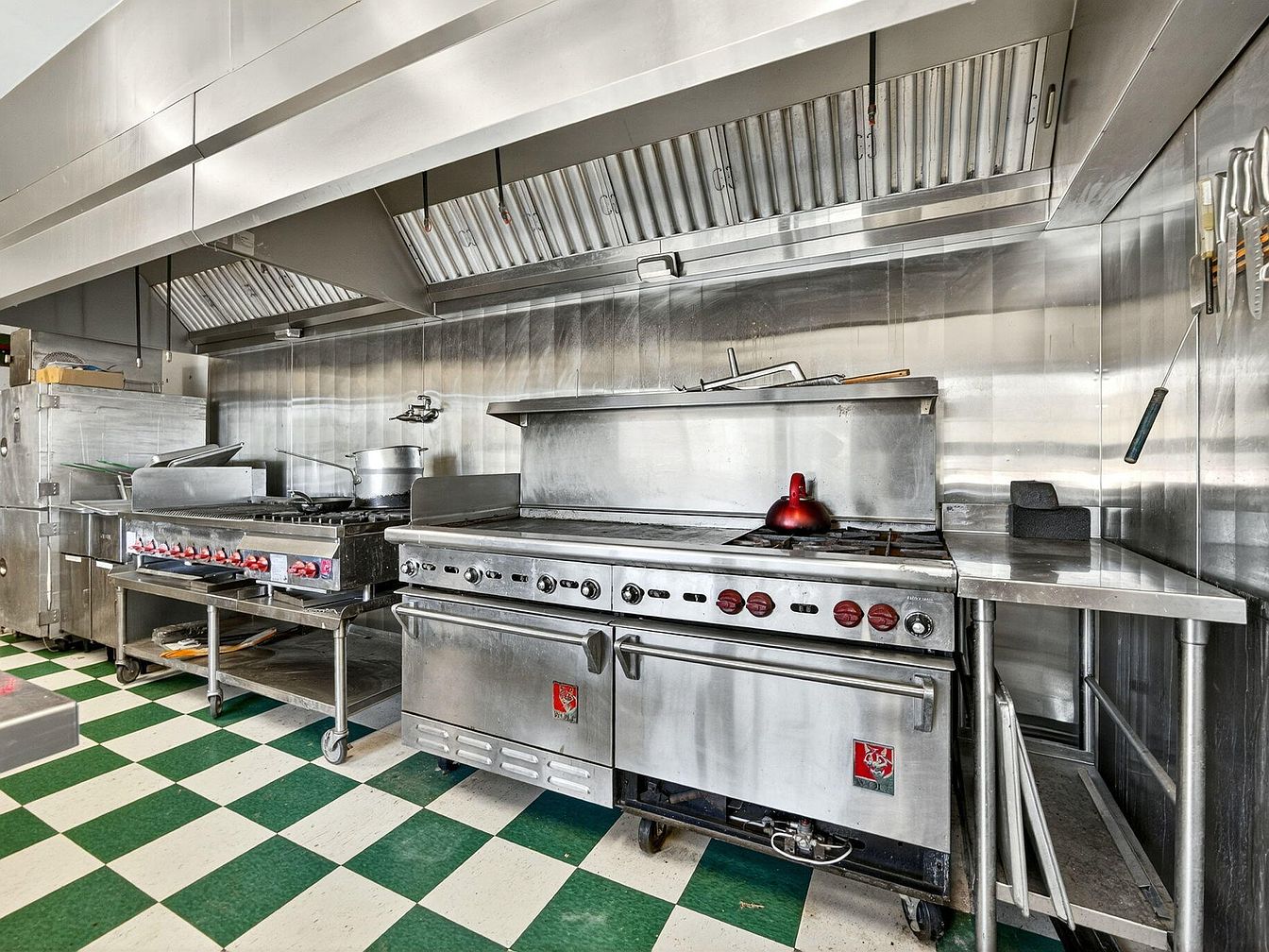 A professional-style kitchen designed for culinary enthusiasts, this space features a robust lineup of stainless steel appliances including an industrial stove, grill, and oven. The walls and counters are finished in matching stainless steel, creating a sleek and easy-to-clean environment ideal for busy family life. Overhead, a generous ventilation system ensures excellent air quality, while ample open shelving and counter space provide room for meal prep and cooking together. The green and white checkered tile flooring adds retro charm and durability, making it both family friendly and visually appealing for gatherings and daily use.