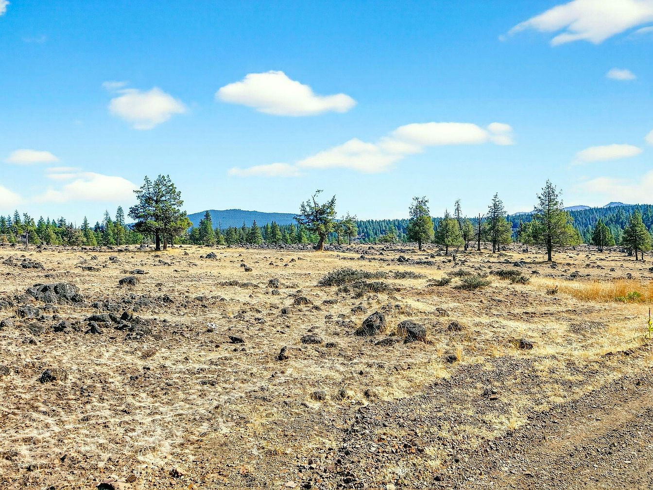 Expansive open backyard offering endless possibilities for outdoor living, entertainment, or play. Dotted with scattered pine trees and punctuated by natural rock formations, this space captures rugged, untamed beauty alongside panoramic views of distant forest and mountain ridgelines. The neutral earthy tones, with golden grasses under a bright blue sky, create a calm and inviting environment. With its vast layout, this backyard is perfect for families seeking a natural setting for exploring, sports, or gardening. The open design encourages creativity and outdoor activities, making it a fantastic place for children and pets to roam freely.