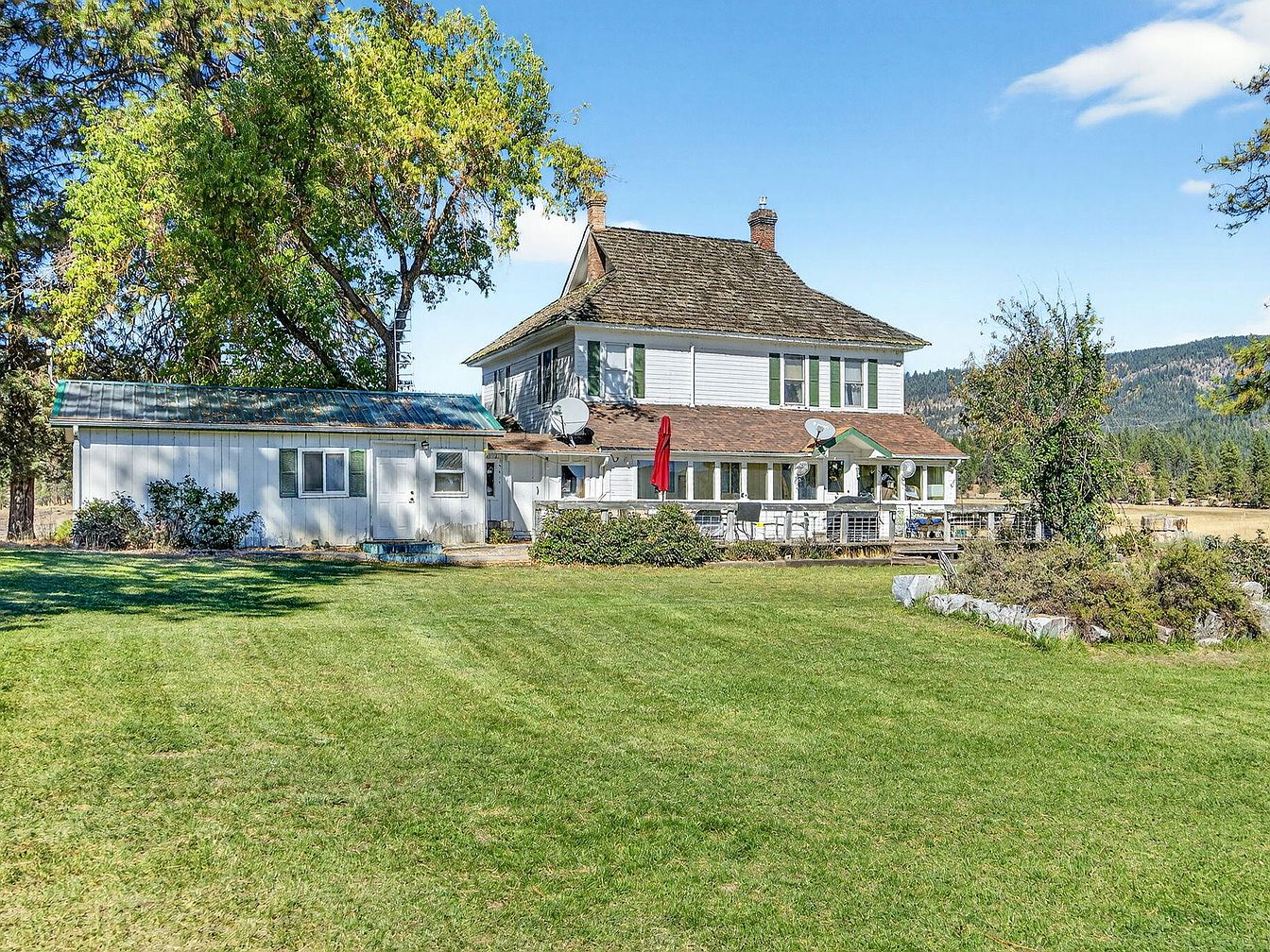 Expansive green lawn stretches up to a charming two-story farmhouse, characterized by classic white siding and forest-green accents. The spacious backyard is ideal for family play, barbecues, or gatherings, with ample running room for children and pets. The patio features comfortable outdoor seating and a large red umbrella, perfect for dining al fresco or relaxing in the shade. Established bushes and mature trees frame the space, adding privacy and natural beauty. The architectural details include traditional multi-pane windows, a sloped shingle roof, and a welcoming deck area that seamlessly connects home life to the scenic mountain backdrop beyond.