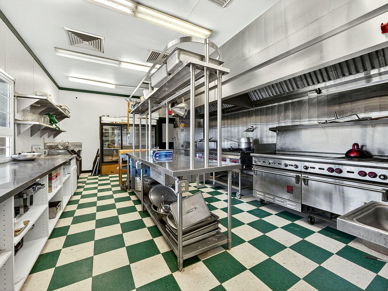 This spacious kitchen offers a commercial-grade layout ideal for large family gatherings or enthusiastic home cooks. Stainless steel countertops, open shelving, and industrial ovens provide durability and ample prep space, while a large central island enables easy organization and collaboration. The green and white checkered floor adds a nostalgic, playful touch, complementing the otherwise sleek and functional ambiance. Bright overhead lights and a clean, open design ensure the area feels welcoming and safe for all ages. The high-capacity refrigerator and logical storage solutions make meal preparation efficient and family-friendly, supporting a lively and connected household environment.
