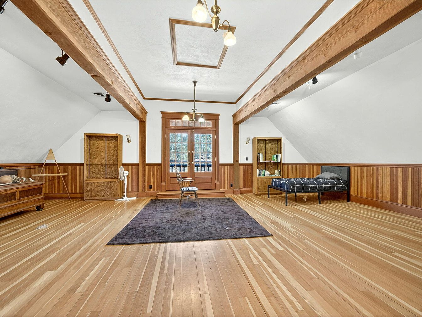 This loft area offers an expansive, open layout perfect for versatile family activities, from playtime to relaxing or studying. Rich wood flooring and matching wood-paneled wainscoting create a warm, inviting atmosphere, while exposed structural beams give architectural character. The room features a single bed and a cozy reading nook with bookshelves, making it ideal for both quiet moments and social gatherings. French doors allow abundant natural light to filter in, complemented by soft lighting fixtures and a centrally placed rug for comfort. The overall neutral palette with natural wood tones makes the space both timeless and family-friendly.