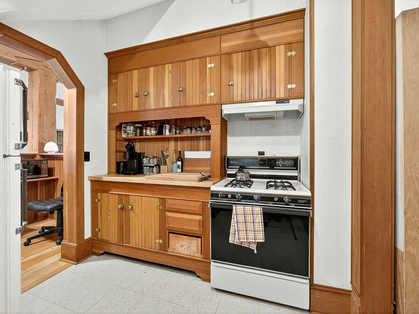 Warm wood tones define this inviting kitchen corner, perfect for family gatherings and daily routines. Custom wood cabinetry with brass hardware provides plenty of storage for dishes, spices, and cooking essentials. The countertop is spacious for meal prep, with a coffee maker and everyday condiments conveniently within arm’s reach. A classic gas stove with a vent hood stands ready for home-cooked meals, and the playful yellow plaid towel adds a cozy touch. Open archways create a seamless flow to adjacent rooms, while durable flooring ensures easy clean-up, ideal for busy family life and entertaining friends.