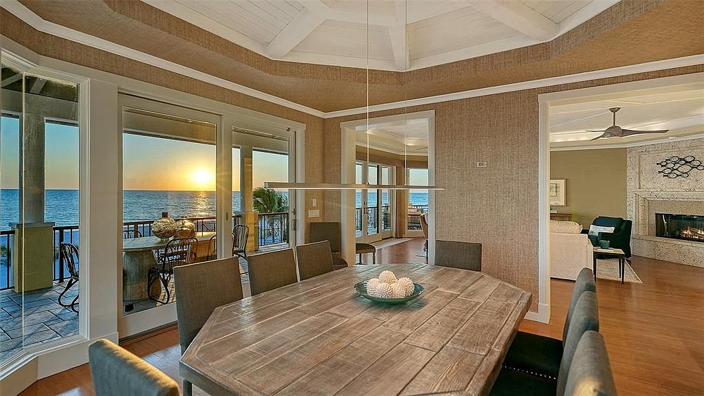 Spacious dining area features a rustic wooden table surrounded by comfortable, upholstered chairs, creating an inviting setting for family meals or entertaining guests. Large floor-to-ceiling windows fill the room with natural light and offer breathtaking ocean views, blending indoor and outdoor beauty. Neutral tones and textured wallpaper complement the warm wood floors, while the white coffered ceiling adds architectural interest and a sense of openness. The adjacent living room with a cozy fireplace ensures easy flow for gatherings. The layout is perfect for family life, providing a safe, functional space with a serene coastal atmosphere that encourages relaxation and togetherness.