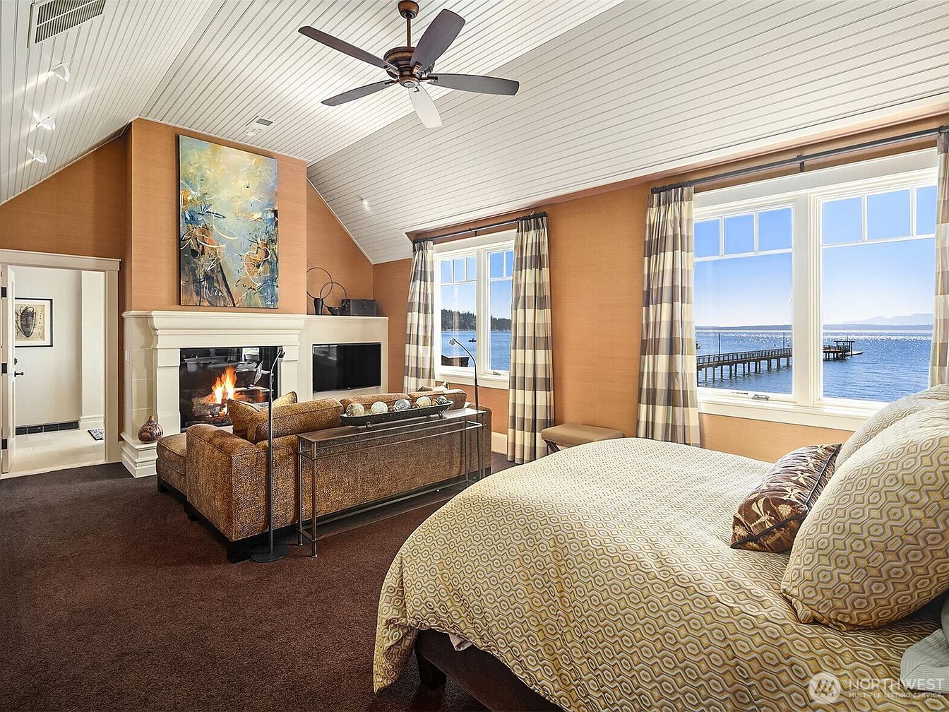 This master bedroom exudes comfort and tranquility, with expansive windows framing stunning waterfront views. The room features warm, earthy tones complemented by a plush chocolate-brown carpet and rich tan walls, creating an inviting atmosphere. A contemporary artwork piece above the stylish fireplace serves as a focal point, adding a touch of personality. The elegant bedding, adorned with geometric patterns, harmonizes with decorative pillows for a cohesive look. Practical family-friendly elements include a cozy seating area with a patterned sofa, perfect for relaxation, and ample natural light flowing in, enhancing the serene ambiance of this restful retreat.