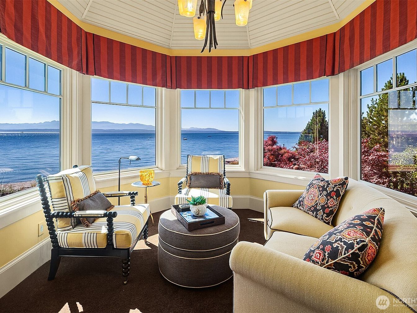 Nestled on iconic Mutiny Bay, this refined estate embodies timeless elegance and status appeal, perfect for the discerning individual seeking success. The property boasts a stunning shingle-style architecture with expansive views of Puget Sound and the Olympic Mountains. Built in a year not specified, the home features over 7,000 sqft of luxurious living space across two beautiful structures, complemented by a detached carriage house for entertaining. Set on over one acre of pristine, gated grounds with 140 ft of private beachfront, this extraordinary offering is fully furnished and turnkey at a listing price of $10,999,950. Recent renovations enhance its allure, making it a true sanctuary of sophistication.