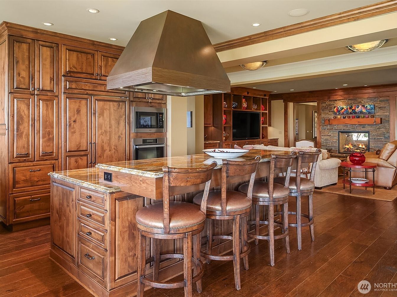 This stunning kitchen showcases a spacious island with a rich, warm wood finish, perfect for family gatherings. Surrounded by elegant high-backed chairs, the island features a beautiful granite countertop, accentuating the rustic charm. Custom cabinetry seamlessly blends with the design, providing ample storage while maintaining a cozy atmosphere. The range hood becomes a focal point, enhancing the visual appeal alongside stainless steel appliances. Soft lighting illuminates the space, emphasizing the inviting color palette of earthy browns and warm neutrals, effortlessly creating a family-friendly environment that feels both luxurious and welcoming.
