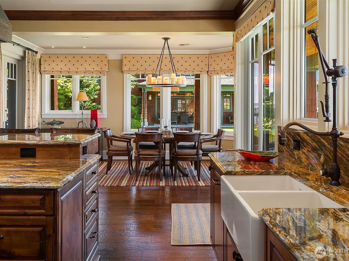 This charming kitchen and dining area combines functionality with inviting aesthetics, perfect for family gatherings. The spacious layout features rich dark wood cabinetry complemented by a sprawling granite countertop that adds a touch of luxury. Large windows usher in natural light, framed by tasteful valances, creating a warm ambiance. The dining space, adjacent to the kitchen, is adorned with a rustic wooden table surrounded by comfortable chairs, encouraging casual family meals. Earthy tones, punctuated by vibrant decor elements, contribute to the cozy, welcoming atmosphere, making it a perfect setting for both culinary creativity and everyday family life.