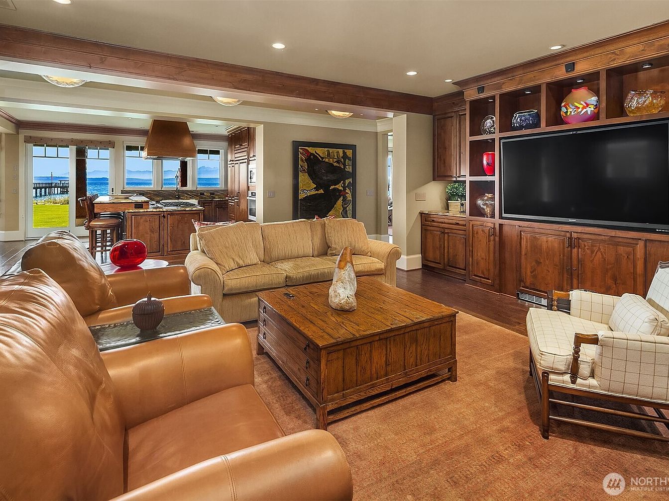 This inviting family room blends comfort and style, featuring rich wooden accents that enhance its warmth. The space exhibits an open layout, allowing natural light to flood in through expansive windows. A plush beige sofa and leather armchairs create a cozy seating area, complemented by a rustic wooden coffee table that anchors the space. The adjacent kitchen is visible beyond, showcasing modern amenities and a stunning view of the outdoor landscape. A soft area rug adds texture, while decorative touches on the custom cabinetry offer personality. Perfect for family gatherings, this room merges functionality with elegant design.