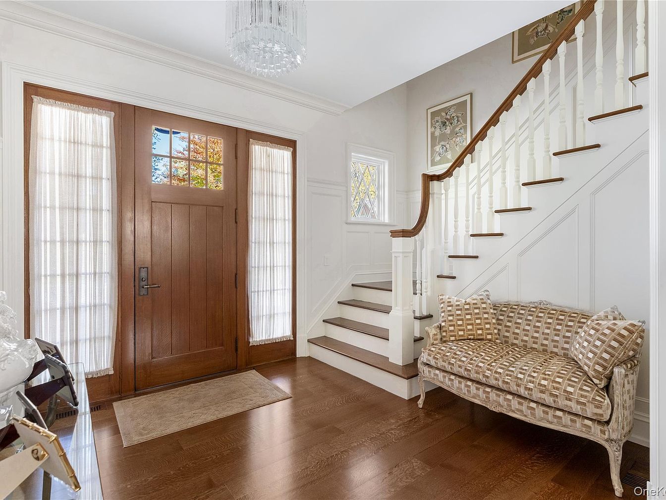 The entryway welcomes guests with elegance and warmth. A sturdy wooden front door features a stylish glass panel, allowing natural light to filter through. The pale walls are accentuated by sophisticated wainscoting, giving a classic touch. Light streams in through floor-to-ceiling sheer curtains, creating a bright, airy atmosphere. A beautifully patterned settee invites relaxation, while the rich hardwood flooring adds warmth and character. The stylish staircase, framed by ornate balusters, leads to the upper levels, hinting at the home’s spacious layout. Overall, this entryway combines comfort and style, making it a perfect introduction to family living.