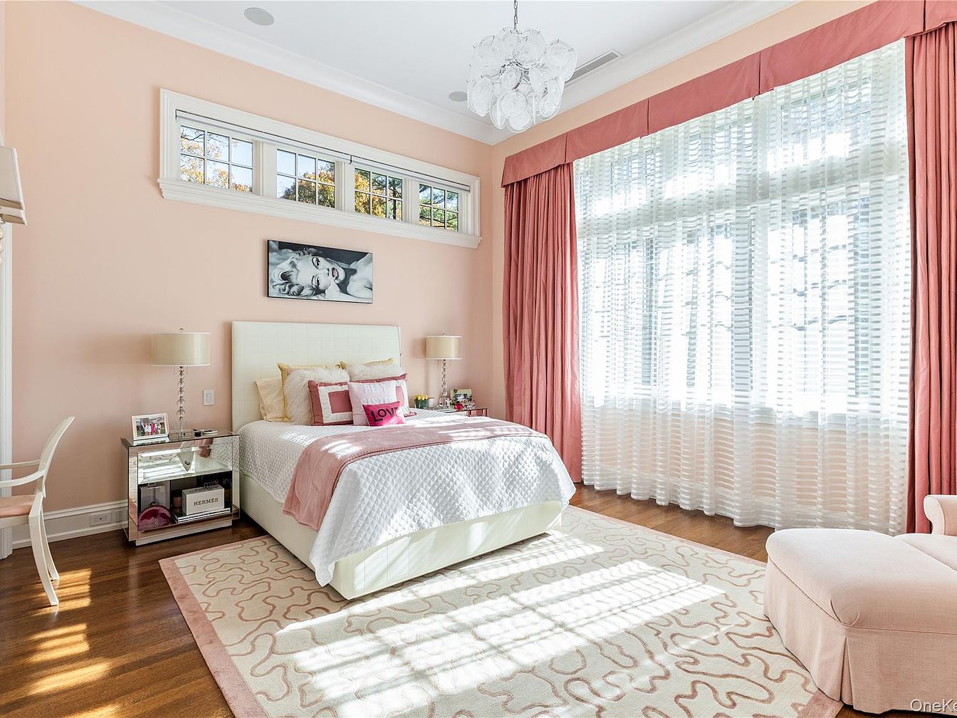 This serene master bedroom combines elegance and comfort, featuring soft peach walls that create a warm ambiance. A plush white bed, adorned with a pink throw blanket, centers the room, flanked by chic mirrored nightstands and stylish lamps. The large window, dressed in sheer white and coral curtains, bathes the space in natural light, enhancing the inviting atmosphere. A cozy lounge chair complements the hardwood floor, layered with a decorative area rug that adds a touch of softness. Thoughtful accents, including artwork and framed photos, personalize the room, making it an ideal retreat for relaxation and rejuvenation.