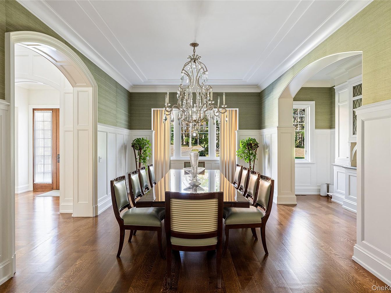 This beautifully designed dining room features a long, polished wooden table surrounded by elegant chairs, ideal for family gatherings and entertaining guests. The soft green wallpaper and wainscoting create a welcoming atmosphere, complemented by the warm tones of the hardwood flooring. A stunning chandelier adds a touch of sophistication, while large windows allow natural light to fill the space, framing a picturesque outdoor view. Potted plants add a refreshing touch, enhancing the room’s inviting ambiance. With its thoughtful layout and stylish details, this dining room is perfect for both intimate dinners and festive celebrations.
