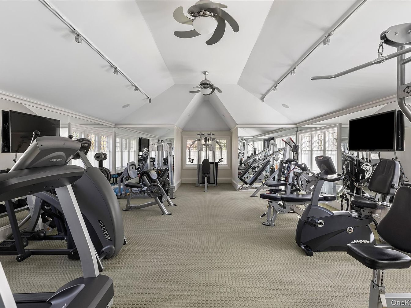 Spacious home gym features a well-organized layout, designed to provide an inviting atmosphere for fitness enthusiasts and families alike. The room boasts high, vaulted ceilings complemented by modern ceiling fans that enhance airflow. A neutral color scheme is established with soft beige carpeting and light walls, creating a calm, motivating environment. The space is equipped with a variety of state-of-the-art workout machines, including treadmills and strength training stations, strategically placed to facilitate movement and accessibility. Large windows offer natural light, while mirrors along the walls create an open feel, allowing for easy workouts and visual motivation.