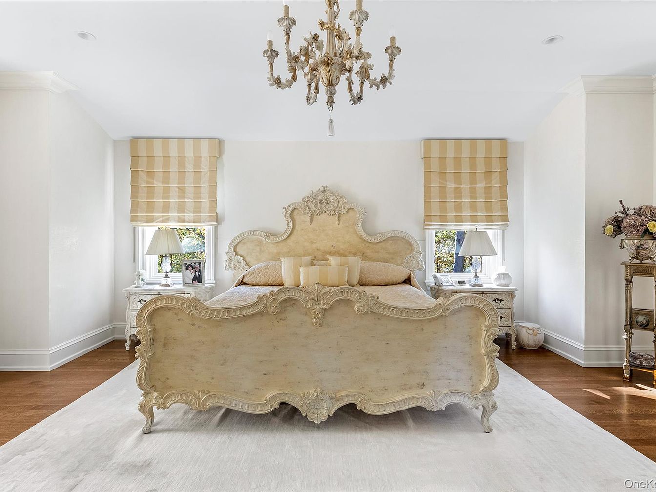 This elegant master bedroom features a stunning vintage-inspired bed with intricate carvings, bringing a touch of classic allure. Soft beige walls and rich hardwood flooring create a warm, inviting atmosphere, while the plush area rug adds comfort underfoot. Two large windows dressed in striped shades allow natural light to emanate, complementing the room’s soft palette. Flanking the bed are ornate side tables topped with tasteful decor and lamps, establishing a cozy reading nook. A chandelier overhead adds a regal touch, making the space feel both luxurious and welcoming, ideal for relaxation and intimate family moments.
