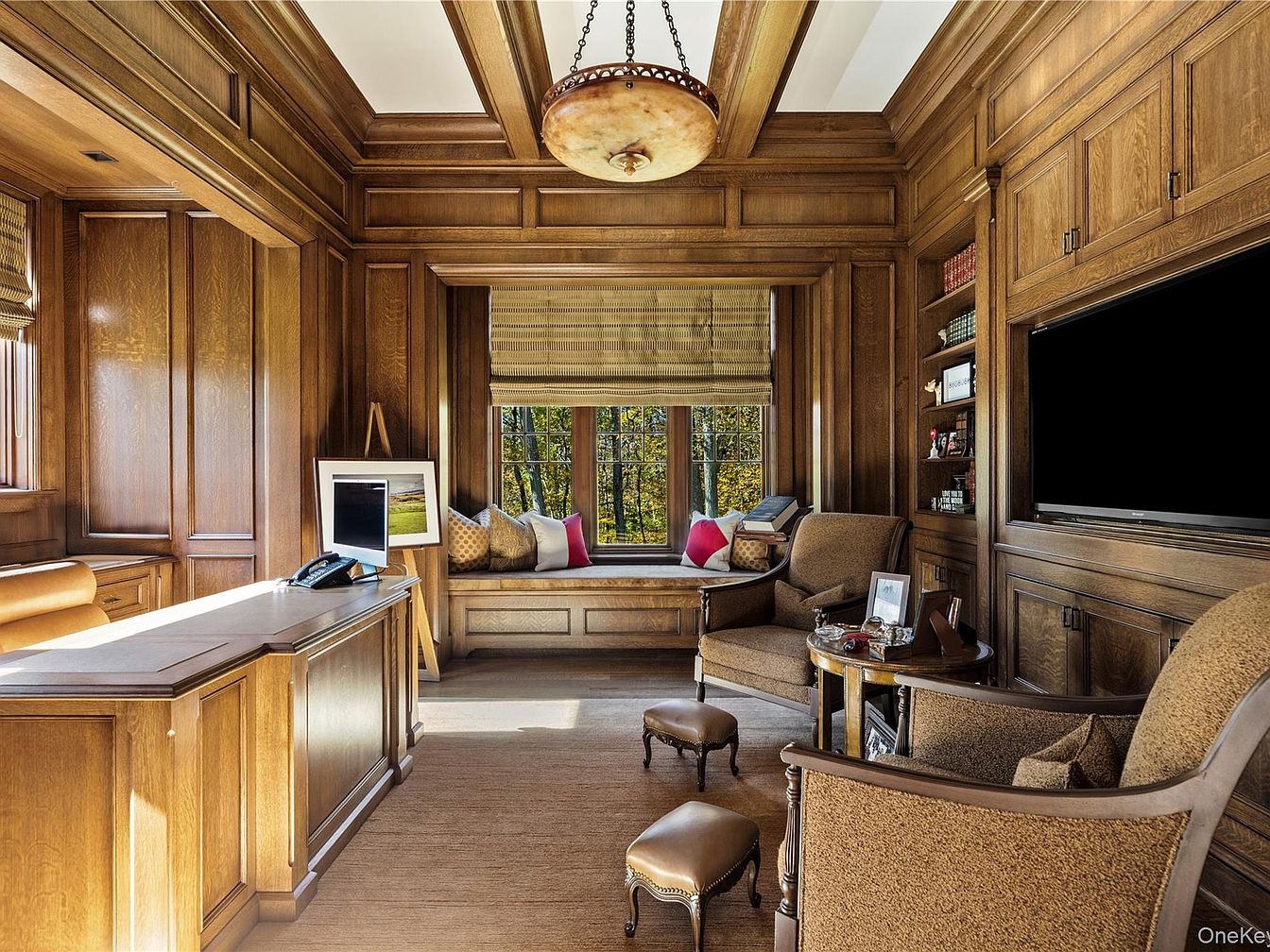 This inviting home office features a rich wooden aesthetic, with polished oak paneling that creates a warm and elegant atmosphere. The layout efficiently incorporates a spacious desk and built-in cabinetry, enhancing functionality while maintaining a stylish appeal. Large windows with soothing shades allow natural light to flood in, offering a serene view of the outdoors. Cozy seating, framed with plush cushions, invites relaxation or casual meetings. The color scheme of earth tones is complemented by subtle decorative accents, including framed artwork and a tasteful chandelier. This space perfectly balances work and comfort, ensuring it’s family-friendly and inviting.