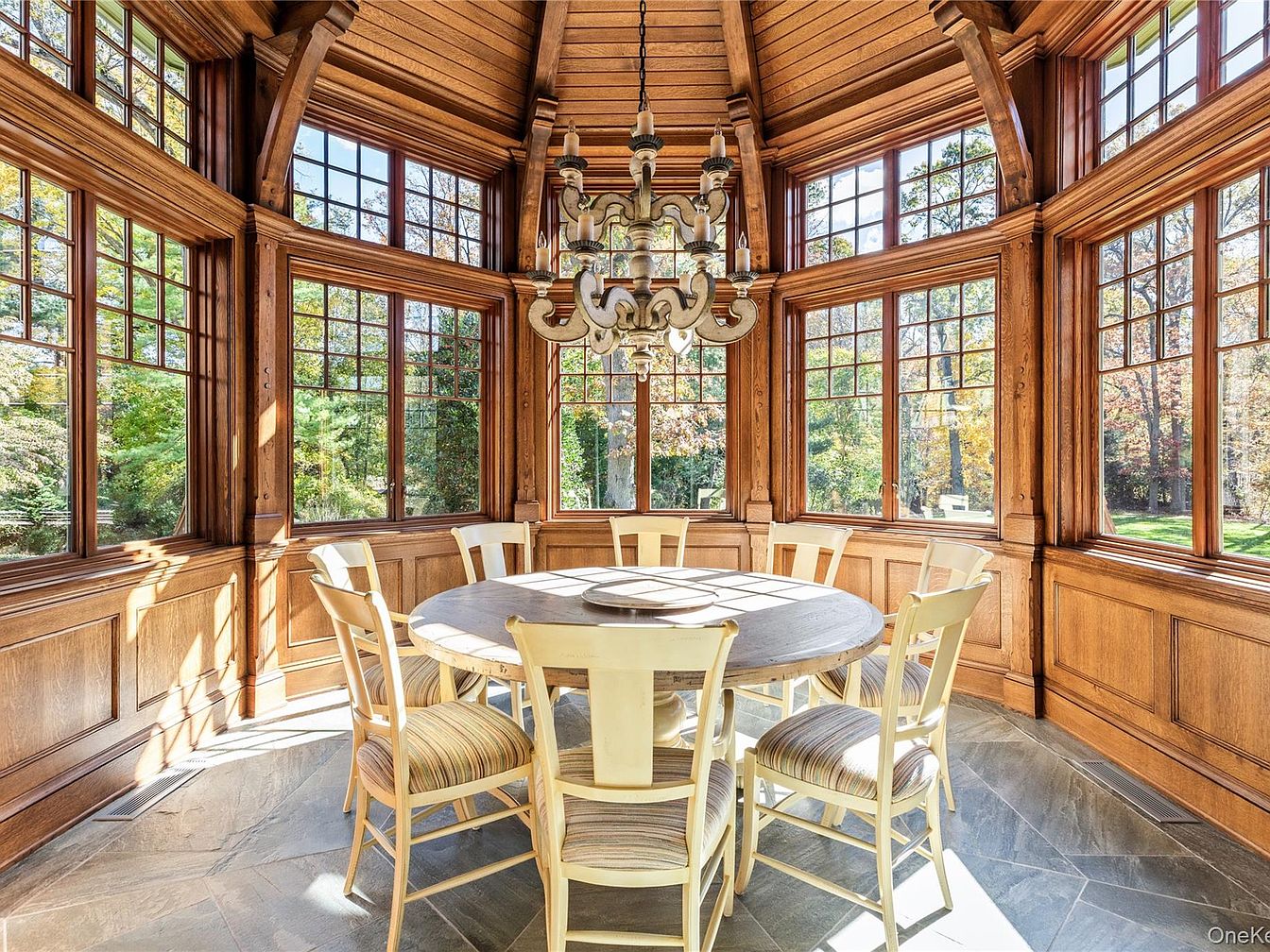 This sunroom features a spacious circular dining table surrounded by elegant, cushioned chairs, creating an inviting atmosphere for family gatherings. Large, multi-paned windows encircle the room, allowing abundant natural light to filter in and offering picturesque views of the lush outdoor scenery. The wooden paneling and vaulted ceiling add a touch of warmth and charm, underscored by a tasteful chandelier that provides a soft glow for evening meals. The slate flooring enhances durability, while the soft color palette of cream and natural wood harmonizes beautifully, making this space both stylish and family-friendly.