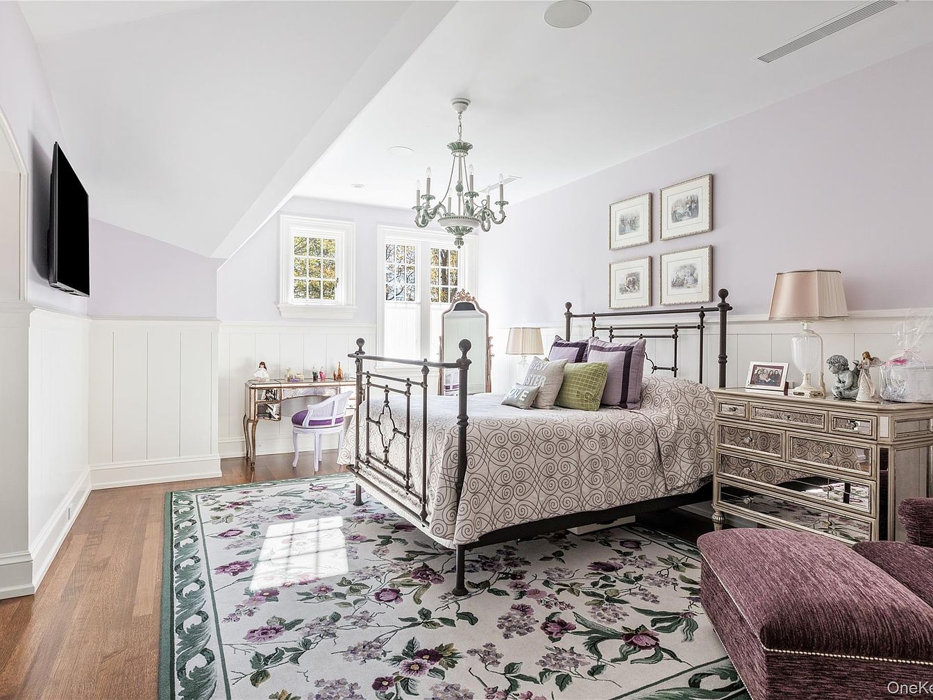 This exquisite master bedroom retreat exudes relaxation and elegance. Featuring a vaulted ceiling, the space is adorned with a soft lavender hue complemented by classic white wainscoting, creating a calming atmosphere. A beautifully patterned area rug adds warmth while a plush purple accent chair invites comfort. The ornate metal bed frame, layered with an array of pillows, becomes the focal point, offering a cozy haven. Mirrored furniture enhances the room’s sophistication, while large windows fill the space with natural light, showcasing a serene view. Thoughtful details like a chandelier and framed art enhance the inviting, family-friendly ambiance.
