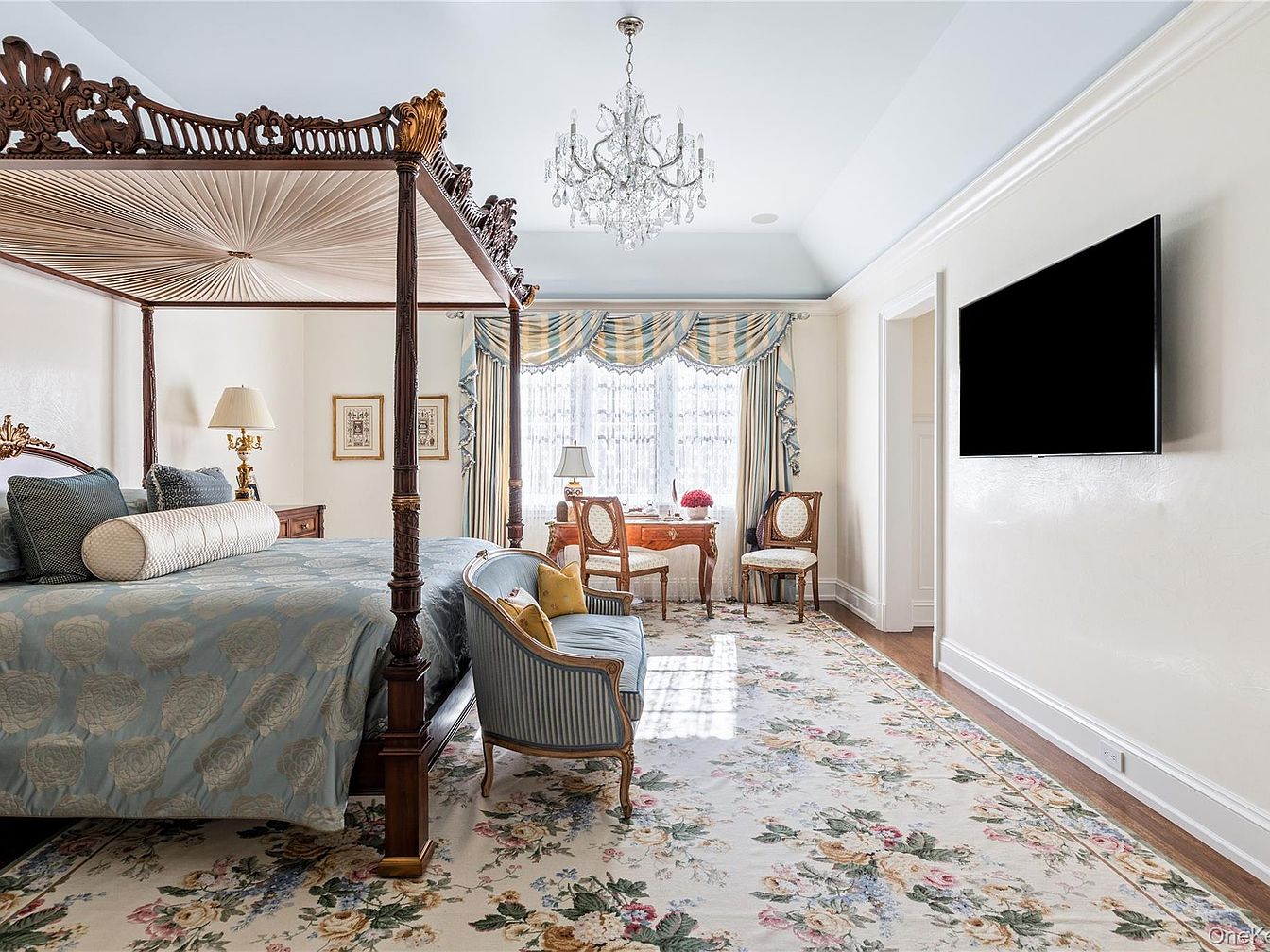 This master bedroom showcases a harmonious blend of classic elegance and comfort. The intricate four-poster bed, adorned with luxurious linens and an inviting array of pillows, serves as a stunning focal point. An exquisite chandelier hangs from the ceiling, reflecting light over the polished hardwood floors and soft floral rug. Complementary hues of blue and cream create a serene ambiance. A cozy sitting area features a vintage chair and a stylish accent chair, perfect for relaxation. Natural light floods through embellished curtains, illuminating a charming wall-mounted television and a tastefully arranged writing desk, enhancing the room’s inviting atmosphere.