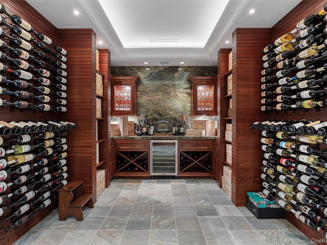 This elegant wine cellar exudes sophistication, designed for both aesthetics and functionality. The walls are lined with meticulously arranged bottles, showcasing a curated selection of fine wines against a backdrop of rich mahogany paneling. A stunning green marble feature wall adds a striking visual element, contrasting beautifully with the natural tones of the slate flooring. The cellar features ample storage, with customizable shelving for wine cases and an under-counter refrigerator for quick access. Soft recessed lighting enhances the inviting atmosphere, making it not just a storage space, but a stylish retreat for wine enthusiasts and gatherings.