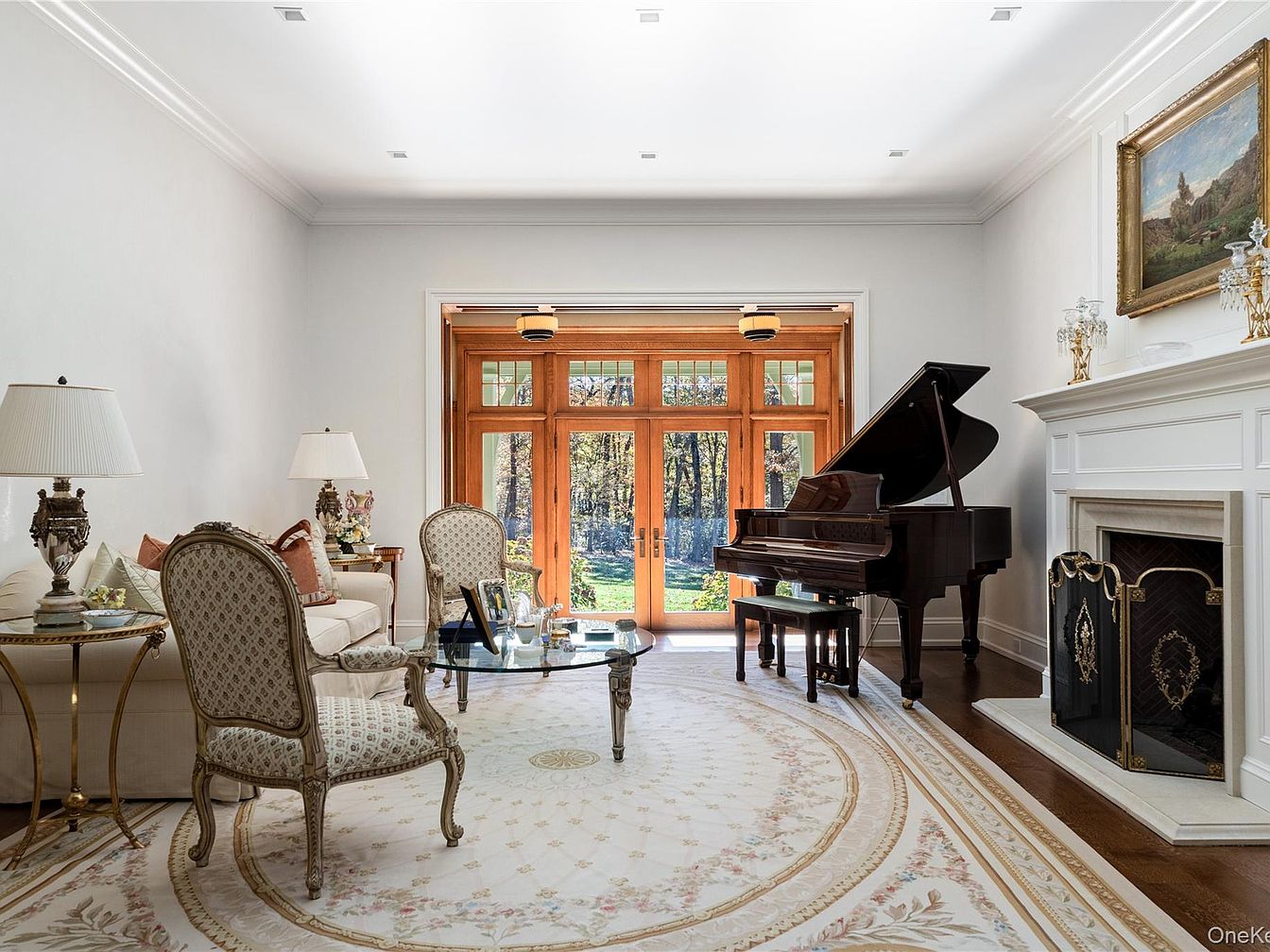 This inviting living room exudes sophistication with its blend of classic and contemporary design. A grand piano stands prominently beside an elegant fireplace, providing a focal point that inspires musical gatherings. The soft neutral color palette is accented by pastel decorative pillows and a vintage rug, creating a warm atmosphere. Two ornate armchairs complement a sleek glass coffee table, perfect for family gatherings or intimate conversations. Bright natural light pours in through large, wooden-framed doors that open to a serene outdoor view, enhancing the space’s airy feel. Decorative elements, like the framed artwork and tasteful lamps, add to the room’s refined elegance.