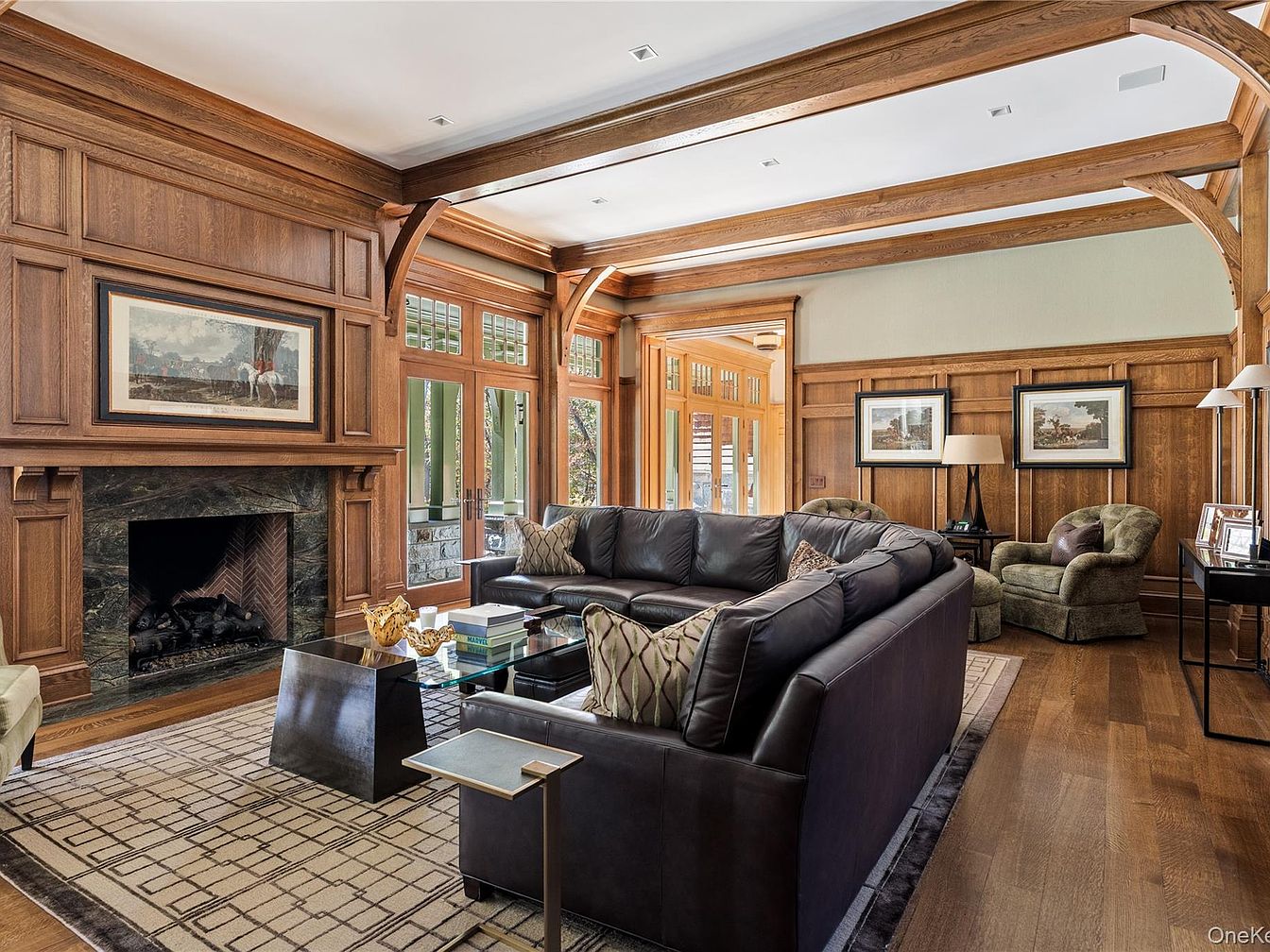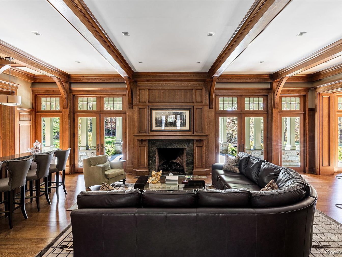 This inviting living room features rich wooden paneling that exudes warmth and sophistication. The layout ingeniously combines elegance with comfort, centered around a plush black leather sectional that encourages family gatherings. A striking dark stone fireplace serves as a focal point, adorned with tasteful artwork above. Natural light pours in through large windows, enhancing the serene ambiance. Earthy tones dominate the color scheme, complemented by a geometric area rug that adds texture. Cozy armchairs invite relaxation, while side tables provide convenience for drinks or decor. The meticulous architectural details, including beamed ceilings, create a classic yet contemporary aesthetic.
