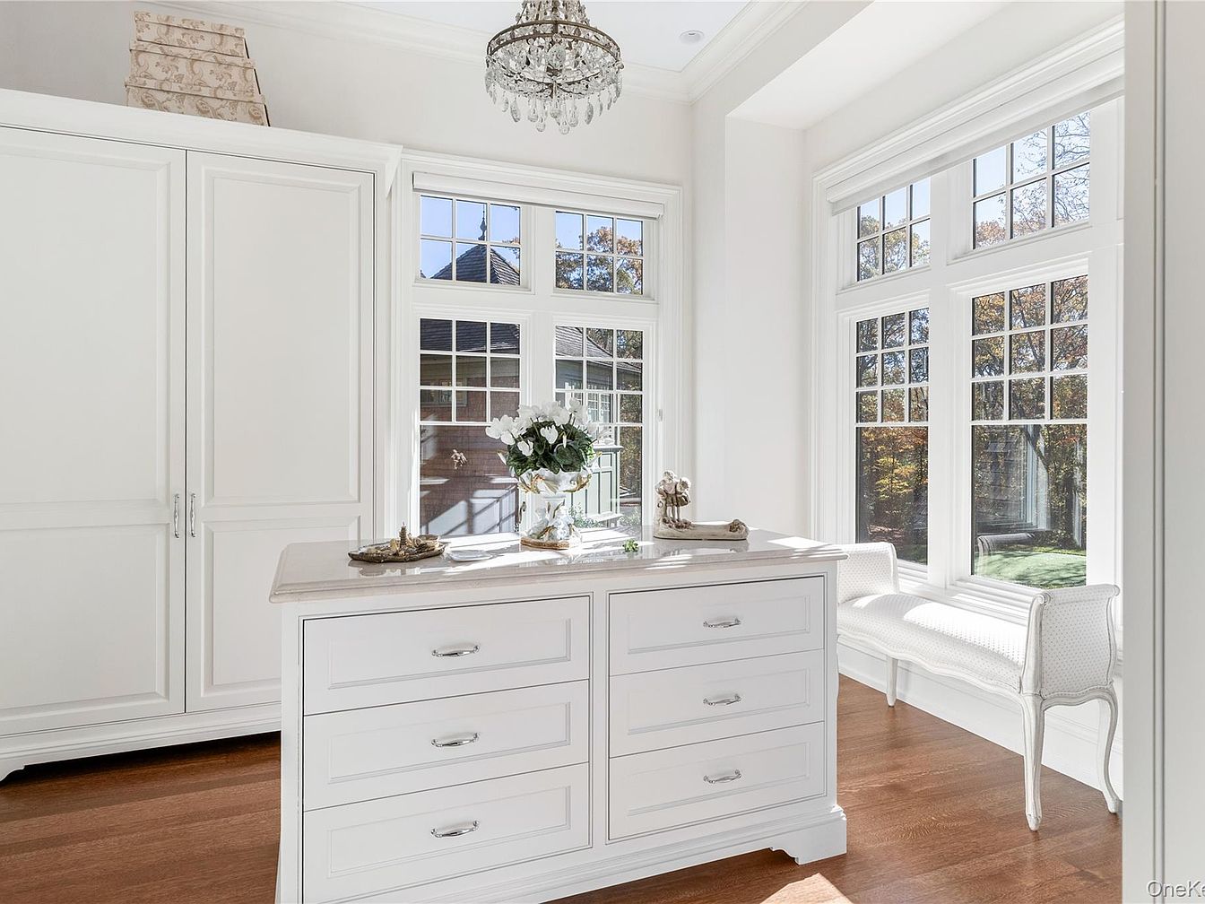 A stunning kitchen island features a polished marble countertop, showcasing both sophistication and functionality. The crisp white cabinetry pairs beautifully with hardwood flooring, creating a warm, inviting atmosphere. Abundant natural light floods through large, multi-paned windows, highlighting the elegant chandelier overhead. This family-friendly space includes built-in storage solutions, ensuring everything is neatly tucked away. A charming white bench nestled by the windows offers a cozy spot for morning coffee or casual conversations. The overall aesthetic combines classic elegance with modern convenience, making it an ideal backdrop for family gatherings and culinary adventures.