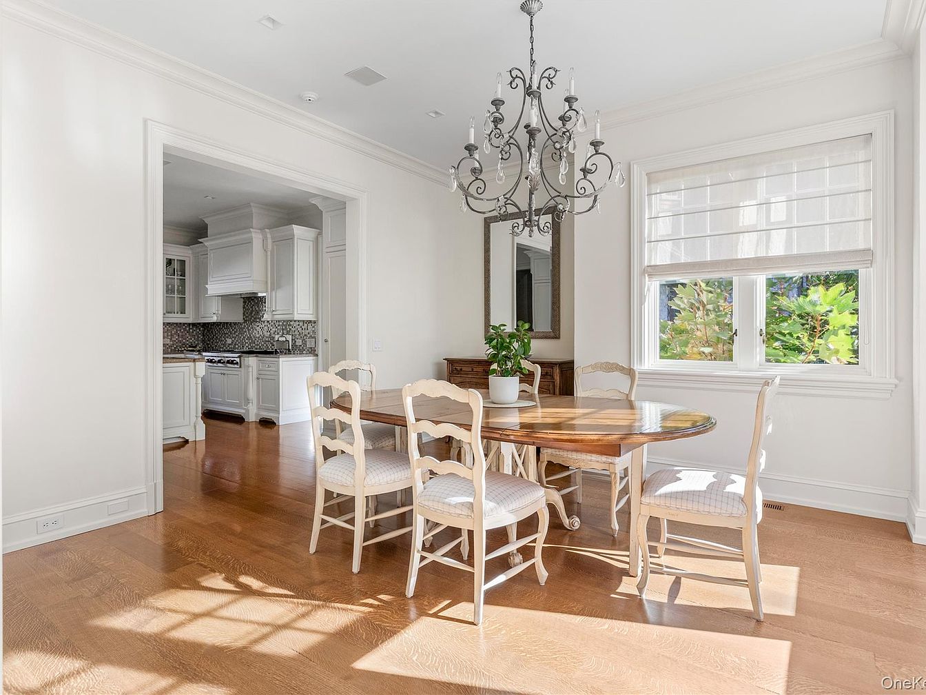 This inviting dining room features a round wooden table surrounded by charming, pale-colored chairs, perfect for casual family meals. Natural light streams through a beautifully dressed window, illuminating the space and highlighting the warm tones of the hardwood floor. Elegant crown molding and a delicate chandelier add a touch of sophistication, while the open entryway leads into a well-appointed kitchen, showcasing modern cabinetry and stylish tile accents. A cozy plant centerpiece brings a hint of greenery indoors, creating a welcoming atmosphere ideal for gatherings and fostering family bonds.