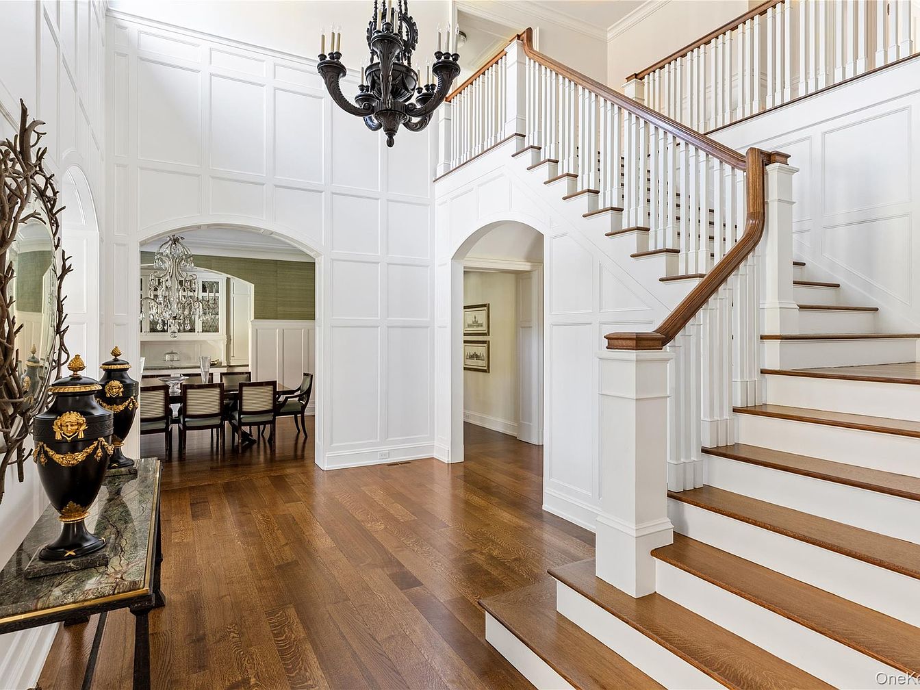 This elegant entryway features a grand staircase with a rich oak handrail, contrasting beautifully against the crisp white wainscoting and paneled walls. A stunning black chandelier casts a soft glow, enhancing the open, airy feel. The warm hardwood flooring creates a welcoming foundation, complemented by a tasteful console table adorned with ornate vases. Archways lead to the dining area, promoting fluidity and inviting interaction among family and guests. The color scheme showcases a blend of dark woods and light neutrals, creating a timeless atmosphere. Architectural details like the detailed molding add character, making this space both inviting and sophisticated.