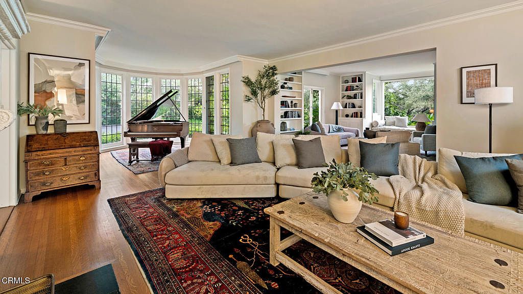 This inviting living room features a spacious open layout seamlessly connected to a cozy nook housing a grand piano, perfect for family gatherings and musical enjoyment. The airy space is designed with large, grid-paned windows that flood the room with natural light and provide picturesque views of the garden. Neutral walls and plush cream-colored sectional sofas pair beautifully with deep blue and taupe accent pillows, creating a relaxing atmosphere. Thoughtful touches, such as a rustic wooden coffee table, an ornate red area rug, and curated greenery, offer warmth and elegance, while built-in bookcases and corner seating encourage both play and relaxation for all ages.