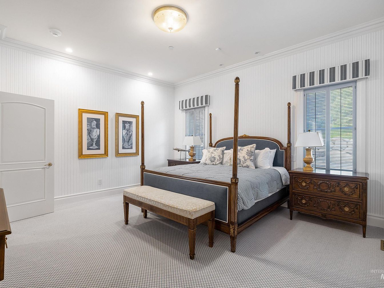 A spacious, inviting primary bedroom blends classic design with comfort, featuring a stately four-poster bed framed by carved wood and plush textiles. Soft neutral tones on the walls and carpet create a soothing atmosphere, enhanced by white trim and delicate pinstripe paneling. Two elegant wooden nightstands topped with white lamps flank the bed, ensuring both style and practicality for family living. Striped window valances add subtle contrast while letting natural light flow in. Decorative artwork in golden frames offers a touch of sophistication. The cozy bench at the foot of the bed makes an ideal spot for relaxing or reading with loved ones.