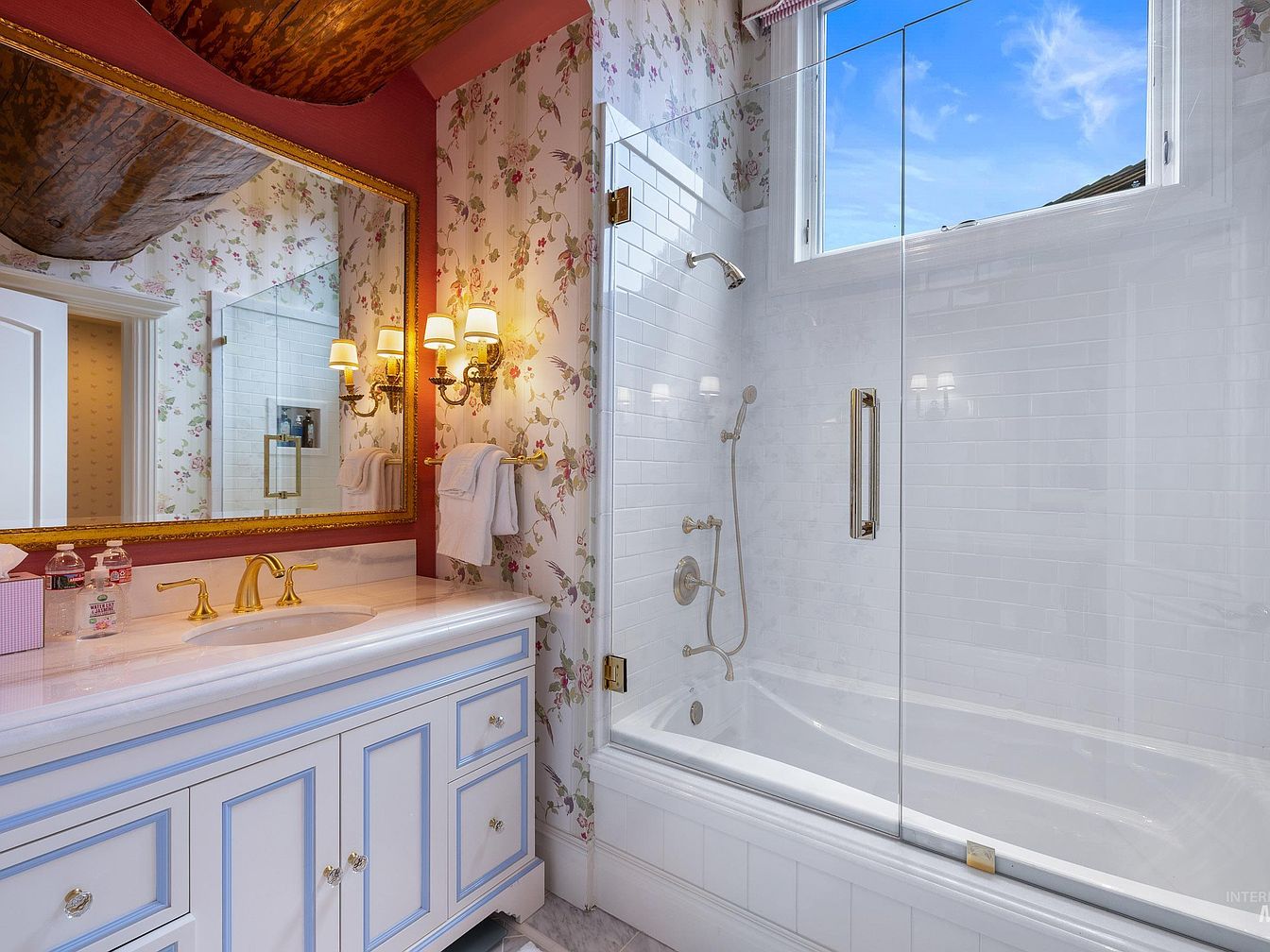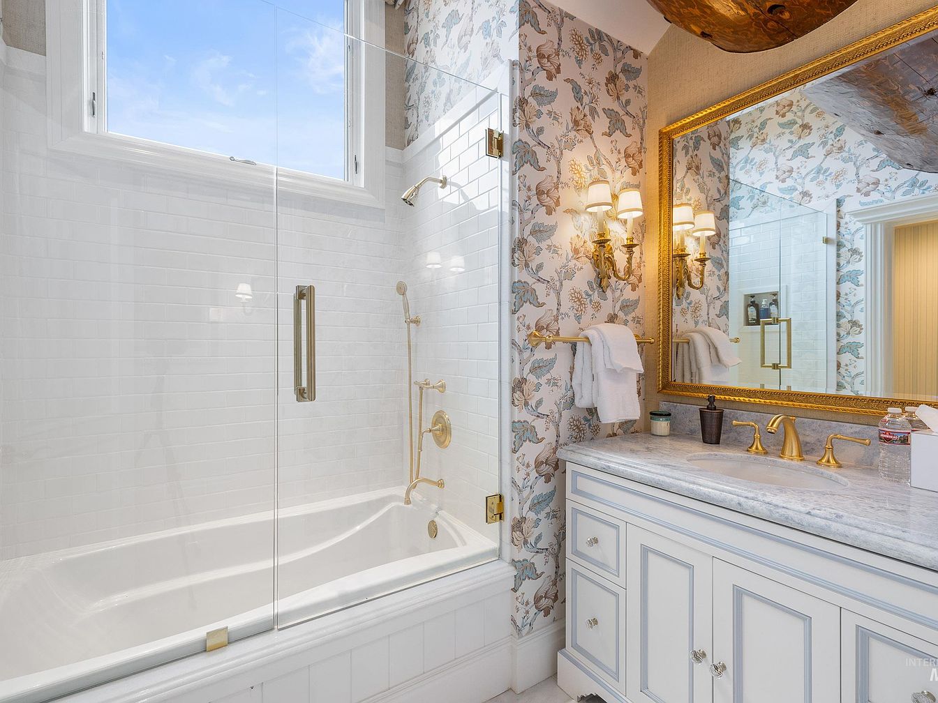 A bright and inviting bathroom features a glass-enclosed bathtub with pristine white subway tile, complemented by gold hardware for a touch of luxury. The built-in vanity offers ample storage and is topped with a marble countertop, elegantly paired with brass fixtures and dual sconces for soft, warm lighting. Floral-patterned wallpaper adds a touch of charm to the space, making it feel both sophisticated and family-friendly. The large, framed mirror enhances the sense of openness, while the soft blue and cream color palette keeps the room feeling airy and tranquil—ideal for both adults and children.