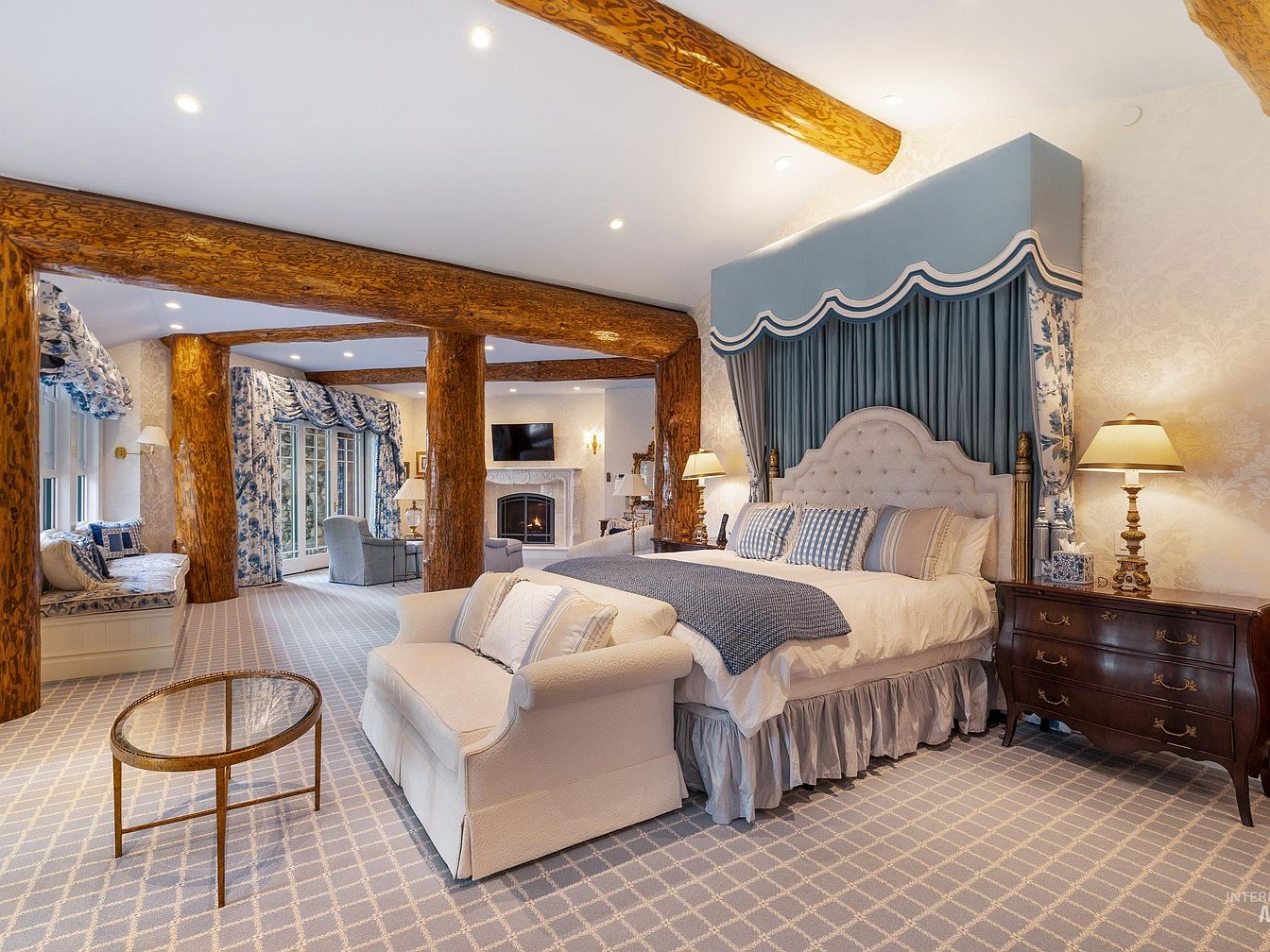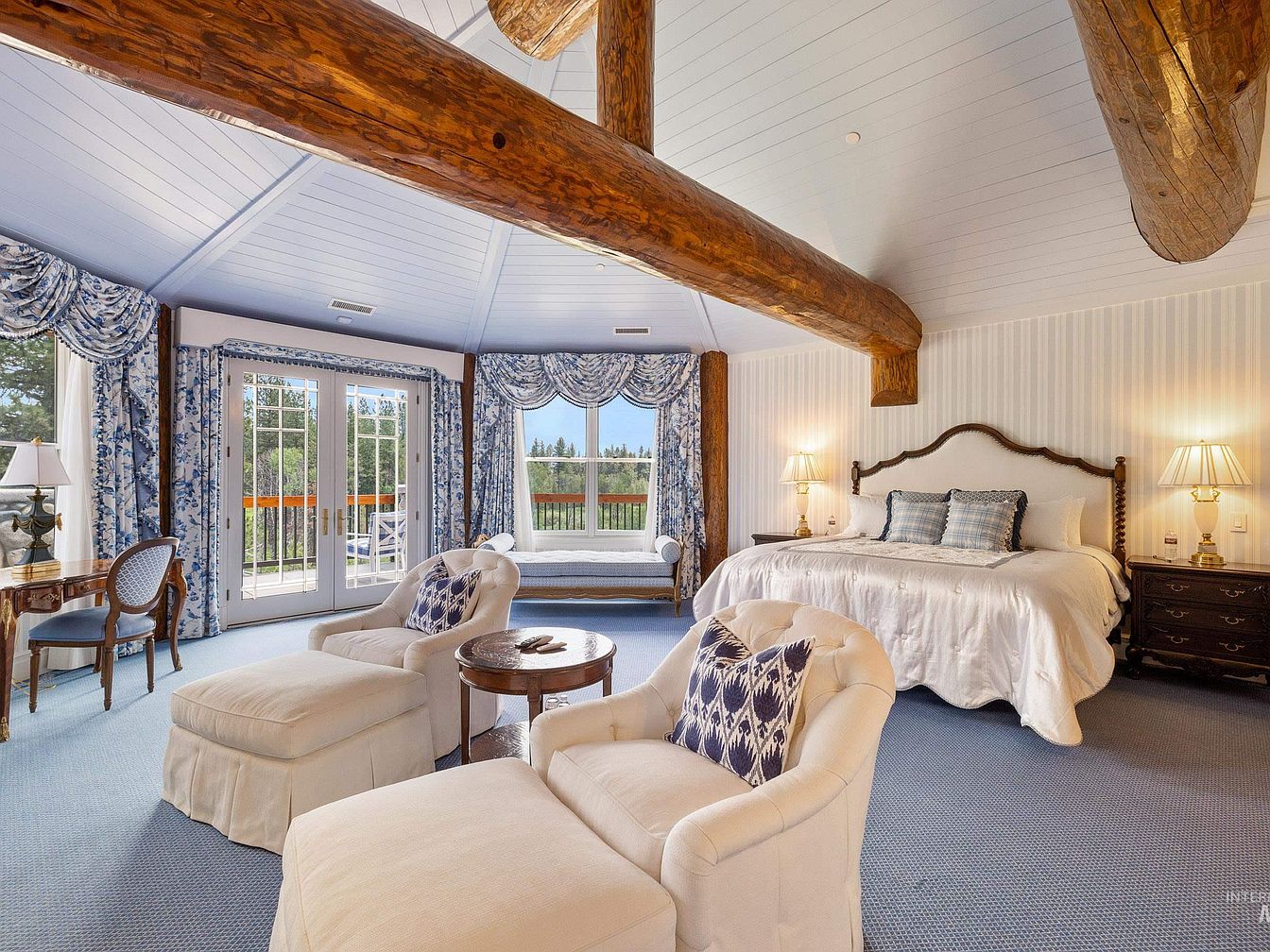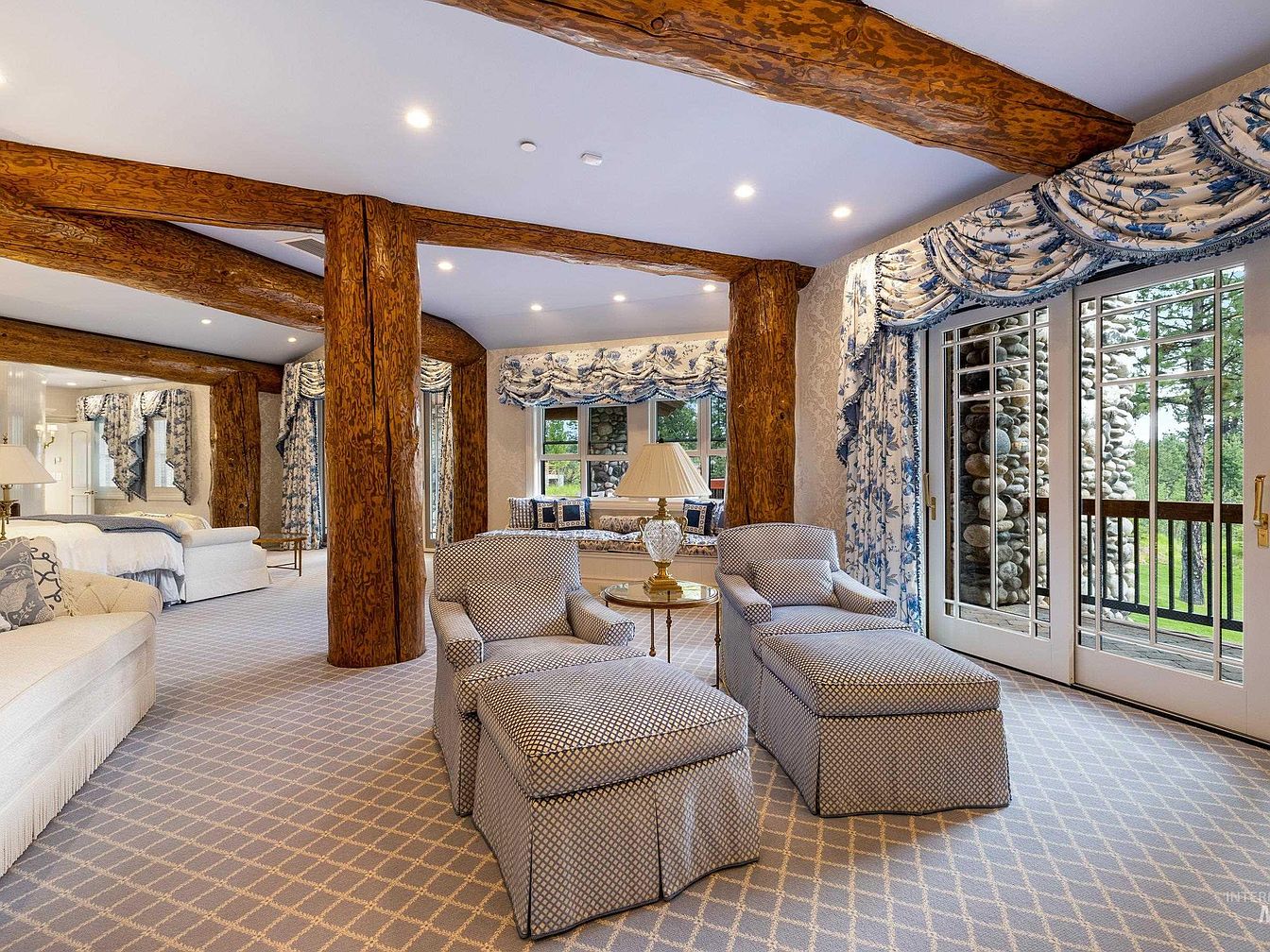 This luxurious master bedroom blends a rustic, lodge-inspired charm with elegant sophistication, featuring massive log beams that anchor the space. Plush carpeting in soft gray tones sets a serene foundation while patterned draperies in blue and white add a touch of classic style. The layout includes a cozy seating area with comfortable armchairs and ottomans, ideal for family conversations or relaxation, and a chic chaise alongside the bed. Expansive glass doors let in natural light and open to a beautiful balcony, merging indoor and outdoor living seamlessly. Neutral furnishings and ornate lamps provide timeless appeal, making this retreat both inviting and family-friendly.