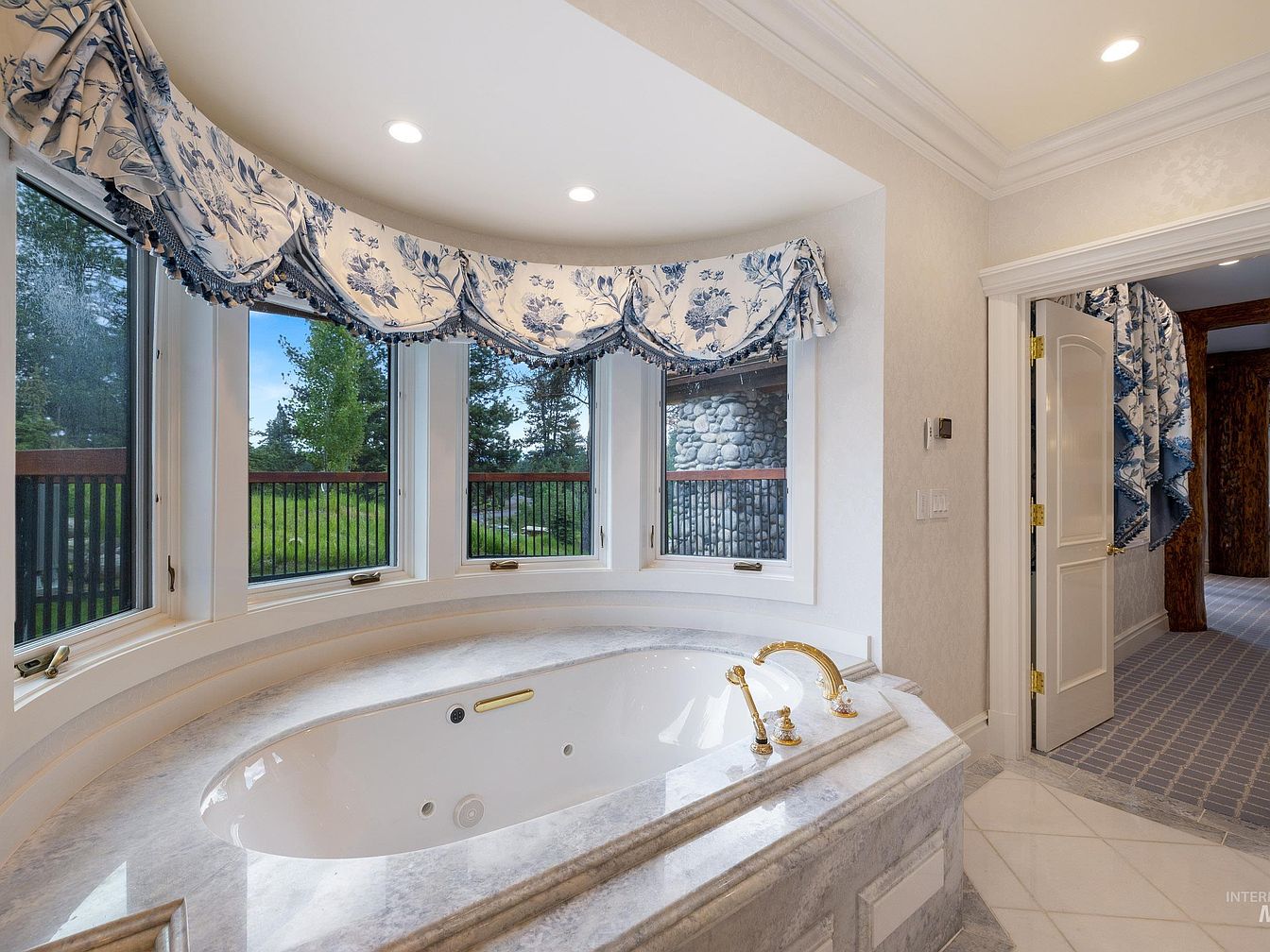 A luxurious soaking tub set beneath a sweeping bay window offers breathtaking views of the green outdoors, inviting relaxation and serenity. The light gray marble surround and gold hardware lend a sense of timeless sophistication, while elegant blue-and-white floral valances add a touch of classic charm. Family-friendly features include spacious ledges around the tub for storage, soft natural lighting, and privacy from the scenic backyard. Off-white walls, subtle patterned wallpaper, and gently recessed lighting create a calming atmosphere. The open doorway leads to a plush-carpeted adjoining room, highlighting seamless flow and comfortable living, ideal for a family retreat.