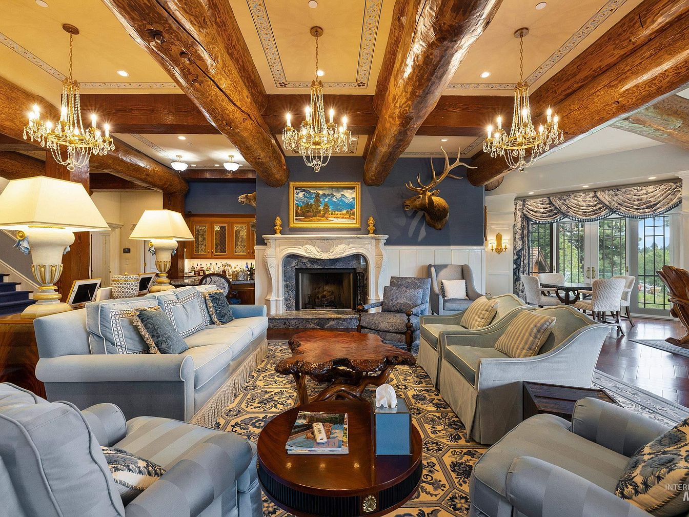 A grand living room blends classic elegance with rustic charm, featuring large polished wood beams across the ceiling and ornate chandeliers that add a touch of opulence. The soft blue and cream color palette creates a calm, inviting atmosphere, enhanced by plush sofas and armchairs arranged in a conversational layout around an intricate live-edge coffee table. A stately white marble fireplace serves as the focal point, framed by traditional moldings, artwork, and a mounted deer head. Floor-to-ceiling windows with elaborate drapery offer natural light and access to a family-friendly dining nook, inviting gatherings and relaxation.