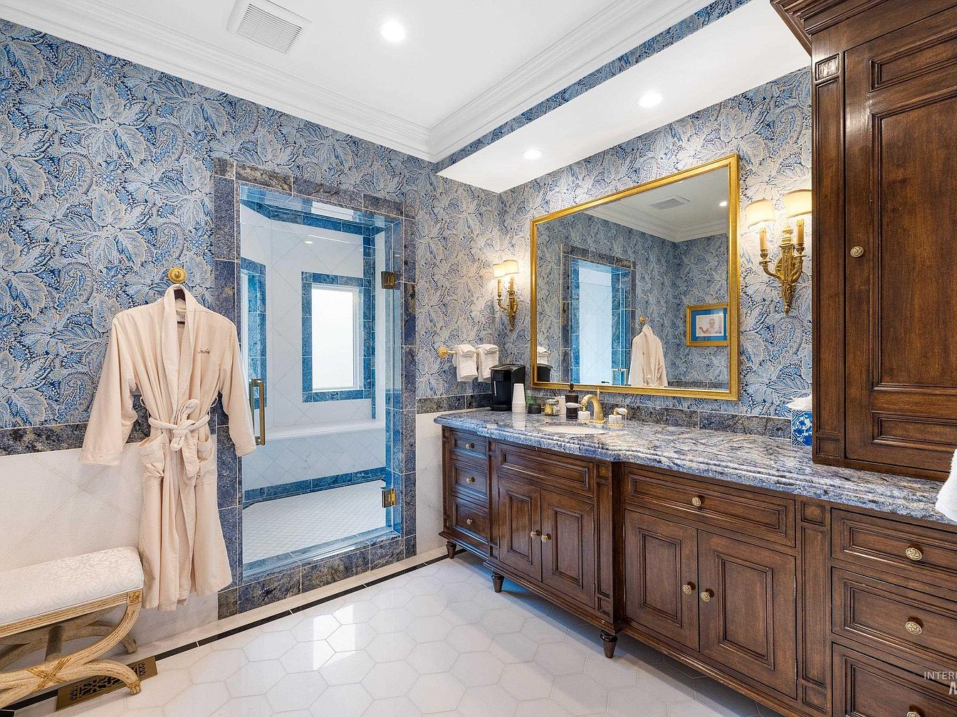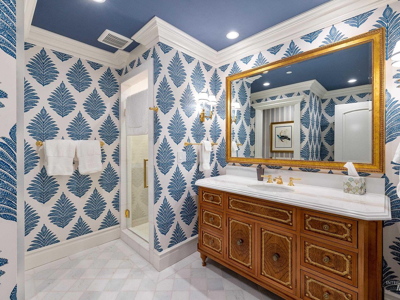 This elegant bathroom vanity area combines a sense of classic luxury with refreshing modern touches. The walls are adorned with bold, blue-and-white botanical wallpaper, creating a vibrant and inviting atmosphere suitable for families. The space features a generous wooden vanity with detailed paneling and a sleek marble countertop, providing ample storage for toiletries. A large gold-framed mirror and brass fixtures add warmth and sophistication, complemented by the deep blue ceiling and crisp white crown molding. Practical details like towel bars and a spacious walk-in shower ensure convenience and comfort, making this bathroom both family-friendly and stylish.