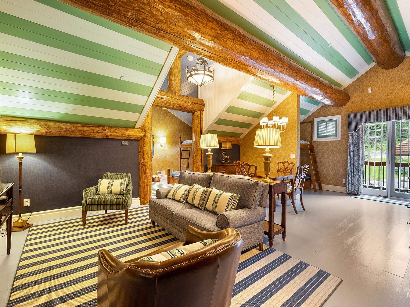 This inviting loft features exposed log beams and a charming sloped ceiling with green and white stripes, creating a cozy yet open atmosphere perfect for family gatherings. The space balances rustic warmth with modern comfort, offering a bright sitting area with a striped rug, plush sofa, and matching armchairs. A wooden dining table sits beneath elegant pendant lights, making it ideal for meals or games. Subtle wall patterns and warm ambient lighting accentuate the space’s homeliness. French doors open to a balcony, providing natural light and a view, while built-in bunk beds in the corner make it ideal for children or sleepovers.