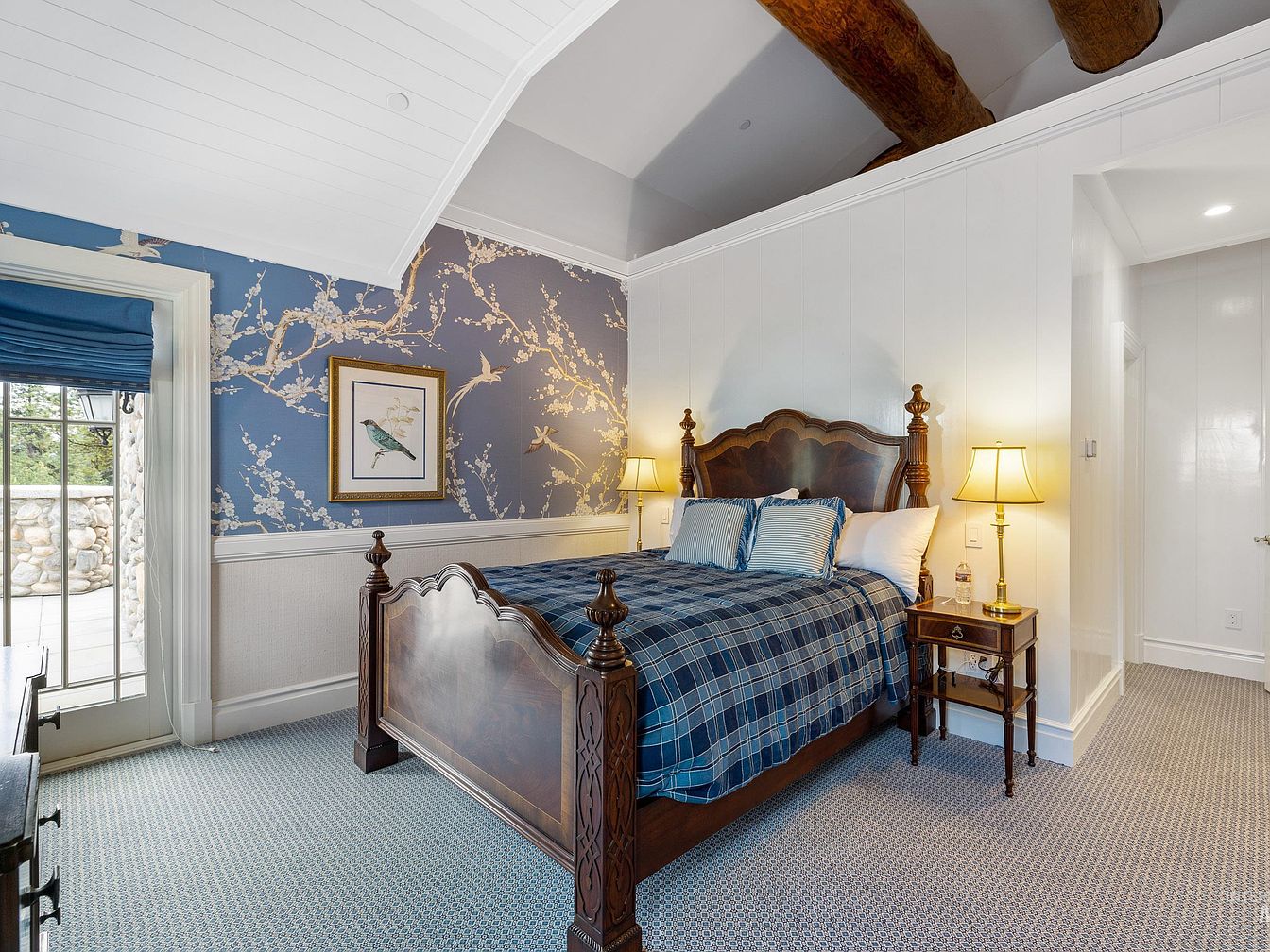 A cozy bedroom combines traditional elegance with modern comfort, ideal for a relaxing family atmosphere. Distinctive wood beams overhead add rustic charm, while a regal, dark wood bed frame anchors the room with sophistication. Blue and white hues dominate the space, with a striking floral accent wall and plaid bedding providing visual interest. Soft patterned carpet offers warmth and comfort underfoot, and matching bedside tables with classic lamps create symmetry and soft lighting. French doors open to a stone patio, inviting natural light and outdoor views, making this space both serene and family-friendly for restful nights or quiet reading.