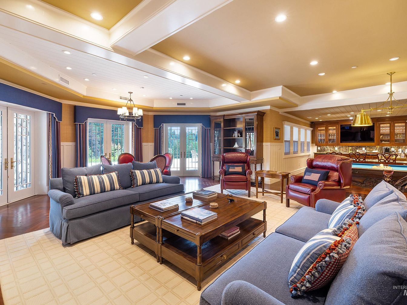 A spacious and welcoming family room blends comfort and style, ideal for gatherings and relaxation. Plush blue sofas with striped cushions offer ample seating, complemented by classic leather armchairs in rich burgundy tones. The room’s open layout seamlessly connects to a sophisticated bar area, enhancing its entertainment appeal. Large French doors invite natural light, while navy and gold tones on the walls and ceiling create a warm, inviting ambiance. Traditional wood coffee and side tables, soft beige carpeting, and built-in cabinetry add both functionality and charm, making this a family-friendly, versatile space suitable for all ages.