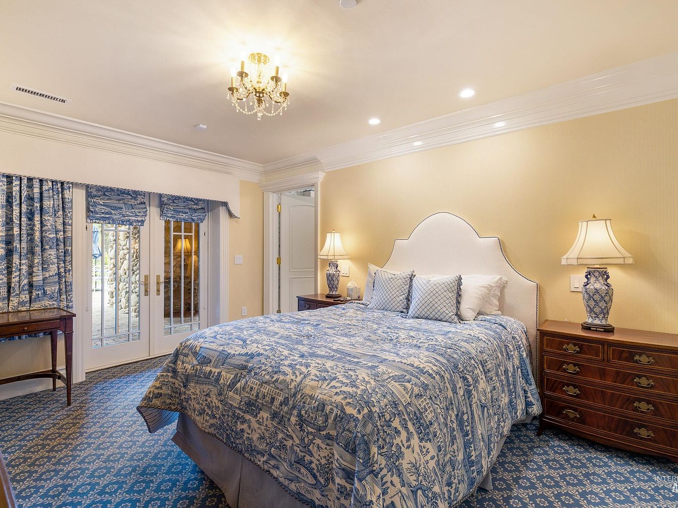 A serene and family-friendly bedroom features a soothing blue and cream color palette, creating a relaxing atmosphere perfect for restful nights. The spacious layout showcases a plush bed with a regal headboard, paired with patterned bedding and matching carpet for a cohesive look. Elegant wooden side tables topped with classic blue-and-white lamps add warmth and sophistication, while French doors provide natural light and access to the outdoors. The large windows, adorned with coordinated roman shades and drapes, offer privacy and style. Ample space allows for easy movement, making the room inviting for families and perfect for unwinding together.